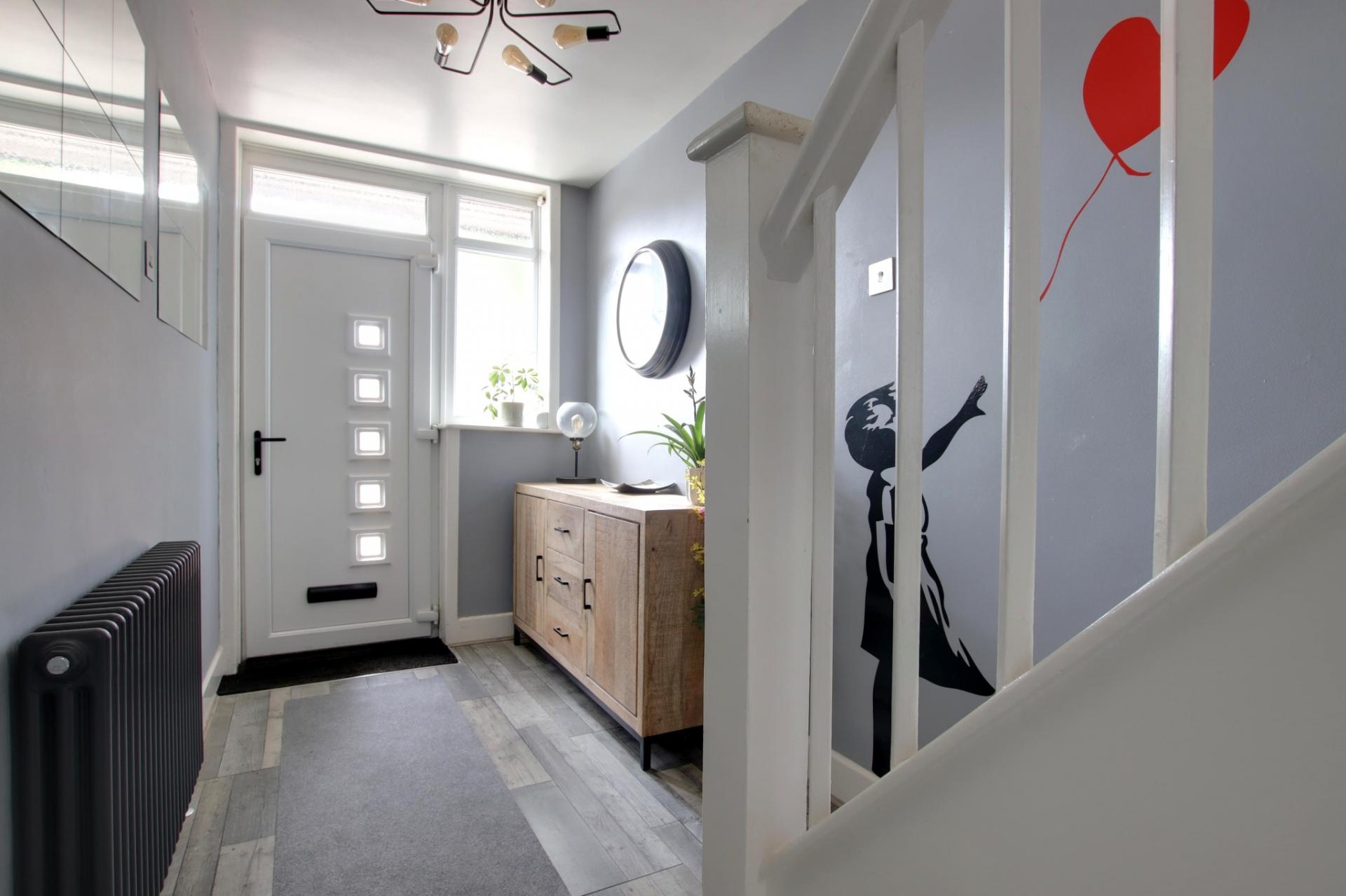 Double glazed front door. Double glazed windows to the front aspect. Smooth ceiling. Staircase rising to the first floor with an understairs storage cupboard with wall mounted ‘Worcester’ boiler. Column style radiator. Wood effect flooring.