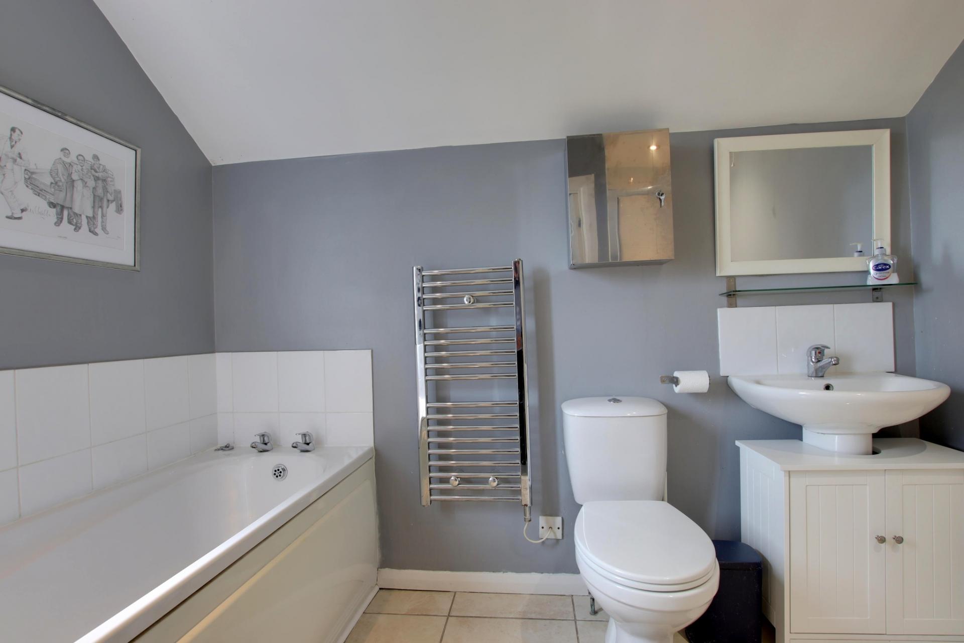 Double glazed window to the side aspect. Smooth ceiling with inset spotlighting. Four piece suite comprising; bath, shower cubicle, low level WC and wash hand basin. Electric heated towel rail and radiator. Part tiled walls. Tiled flooring.