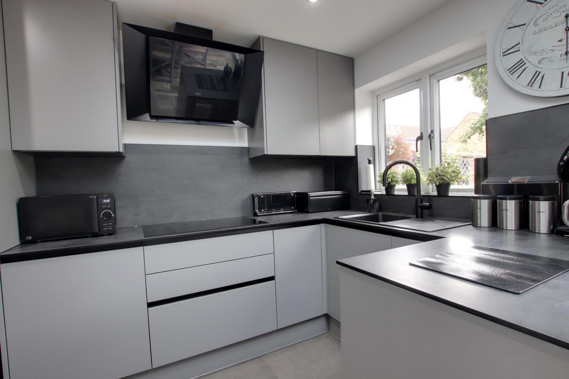 Double glazed window to the rear aspect. Smooth ceiling with a double glazed roof lantern. Matching wall and base matt handleless units with compact laminate worktops. Inset sink and drainer with a ‘Quooker’ three in one hot tap. Appliances include an ‘AEG’ five ring induction hob with matching extractor hood, ‘AEG’ twin ovens and integrated ‘AEG’ fridge/freezer, washer/dryer and dishwasher. Tiled flooring.