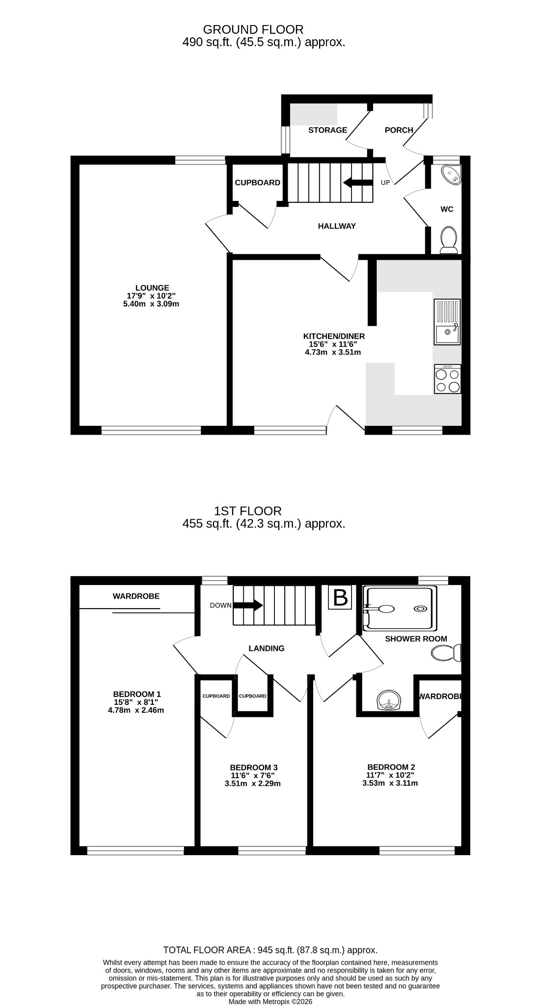 Double glazed window to the front aspect. Suite comprising; shower cubicle, wash hand basin and low level WC. Heated towel rail. Part aquaboarding splashback. Vinyl flooring.