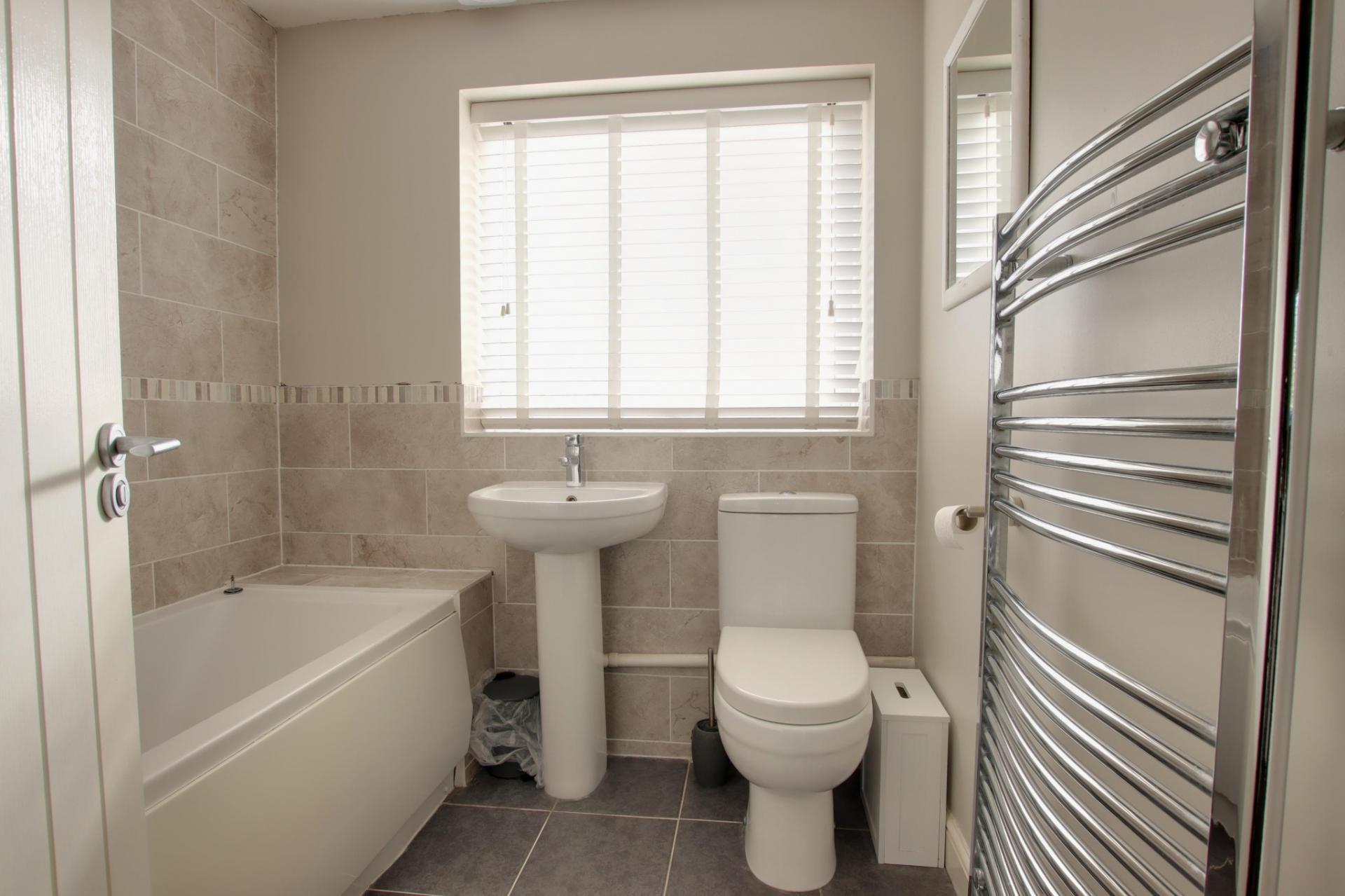 Double glazed window to the front aspect. Smooth ceiling with inset spotlighting. Extractor fan. Suite comprising bath with shower over and screen. Wash hand basin. Low level WC. Heated towel rail. Part tiled walls. Tiled flooring.