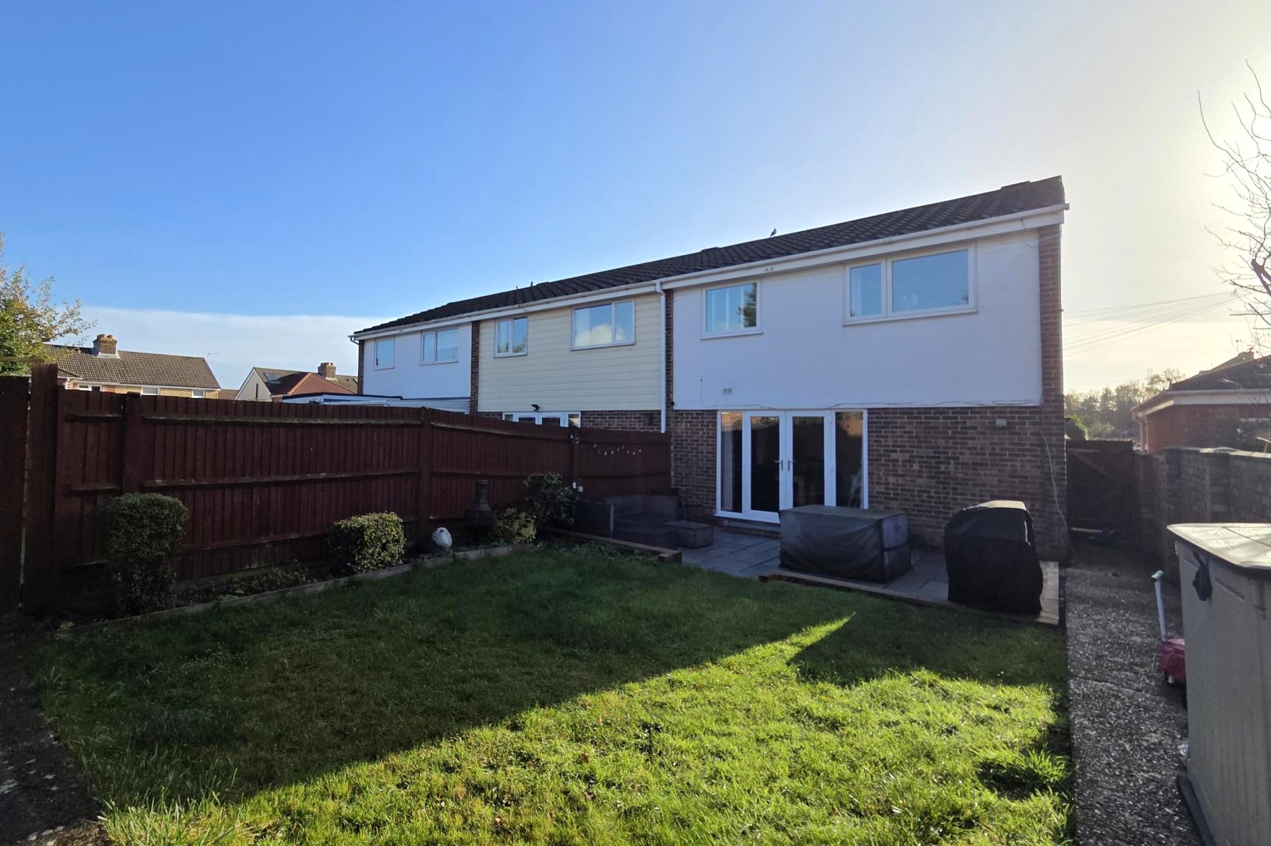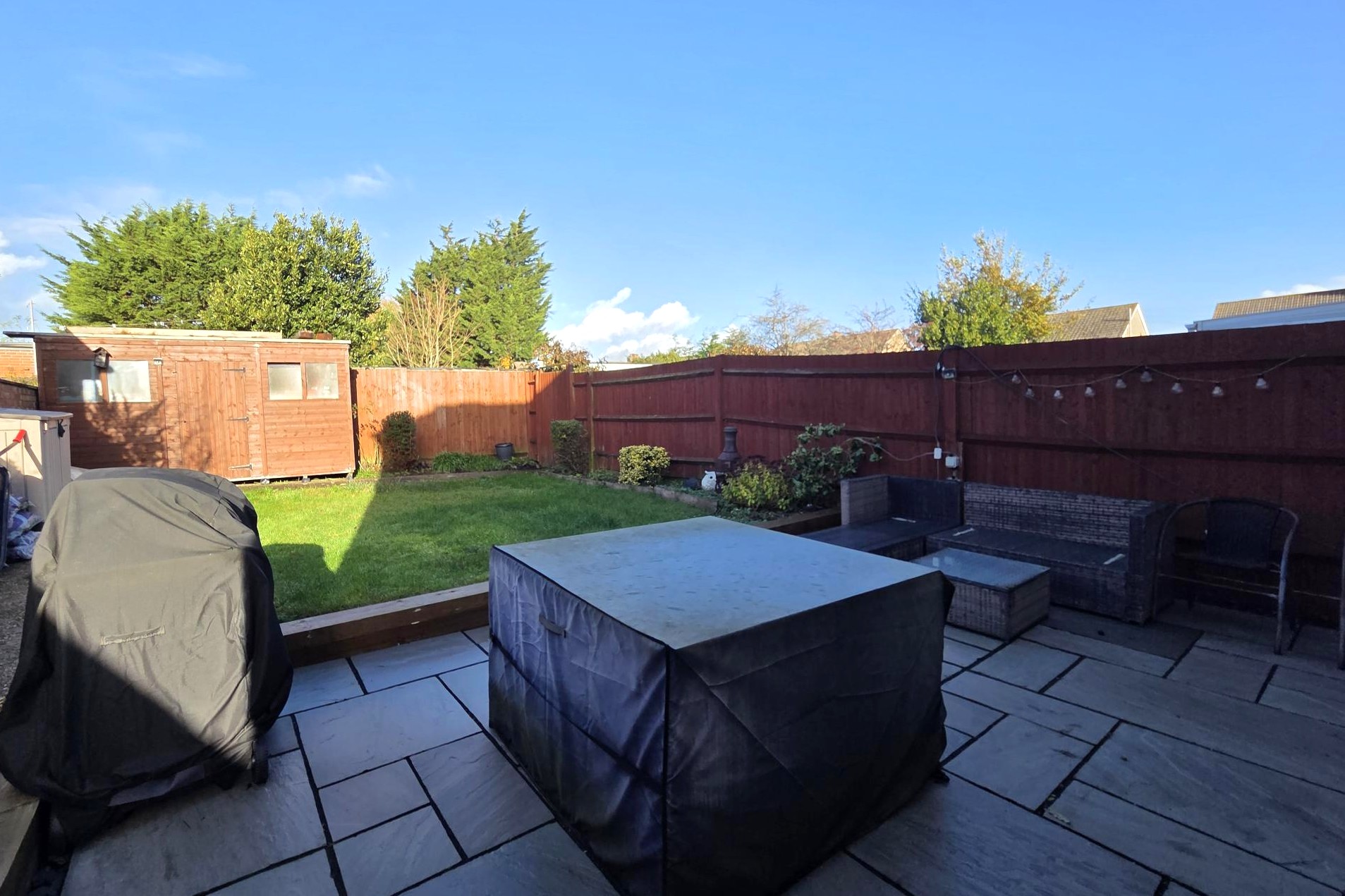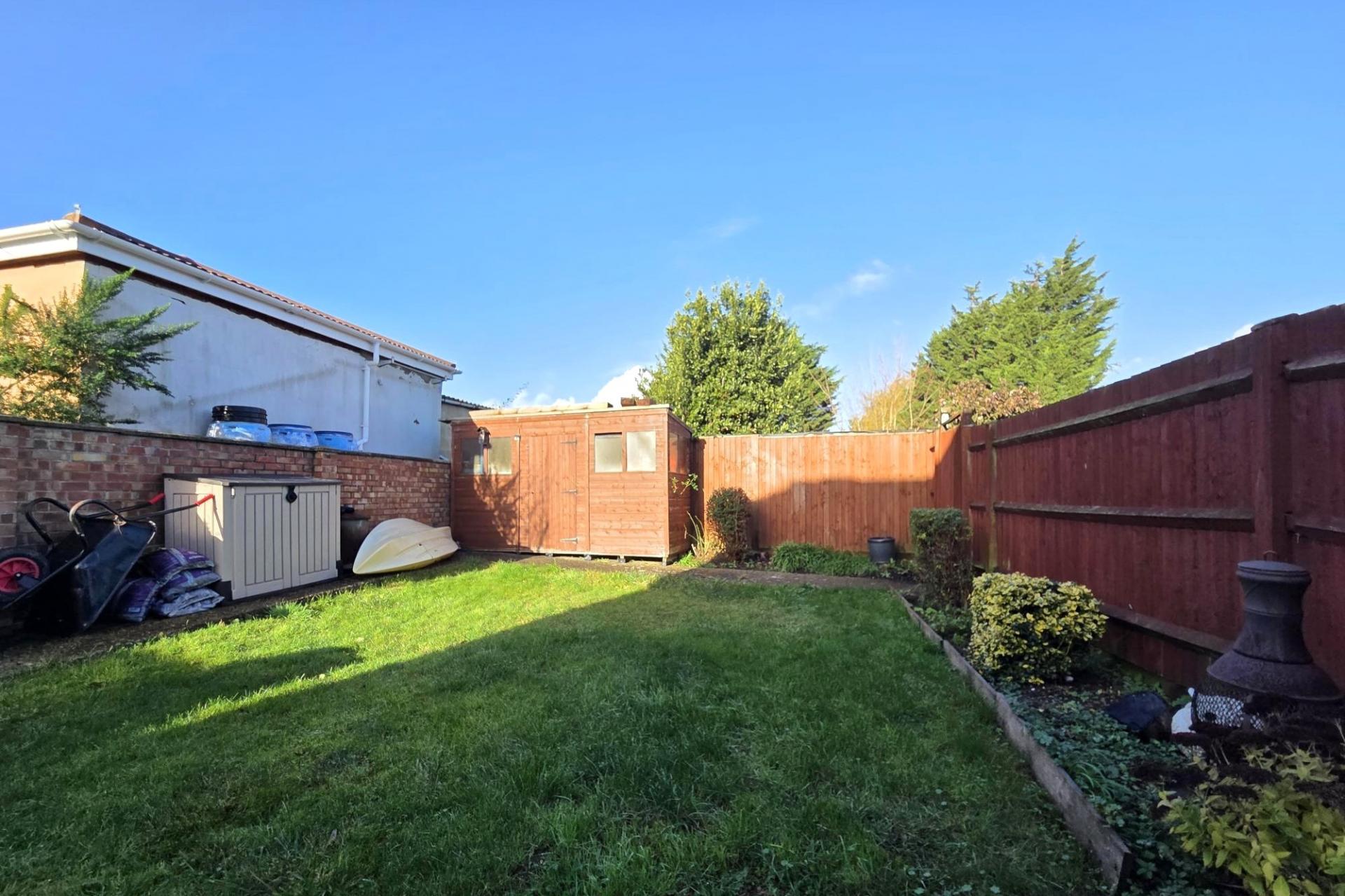 The landscaped rear garden has an initial Indian sandstone patio with the remainder of the garden being laid to lawn with shrubs and borders. Timber garden shed. Side gated pedestrian access leading to the front garden.