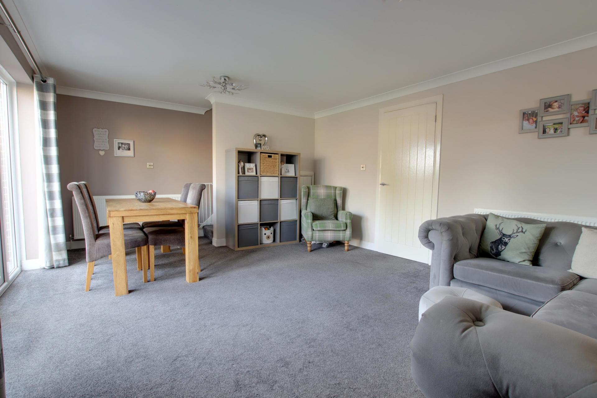 Dual aspect with two tall double glazed windows to the rear aspect and a further two double glazed windows to the side aspect. Double glazed French doors leading to the rear garden. Smooth and coved ceiling. Two radiators. Staircase rising to the first floor. Understairs storage cupboard.
