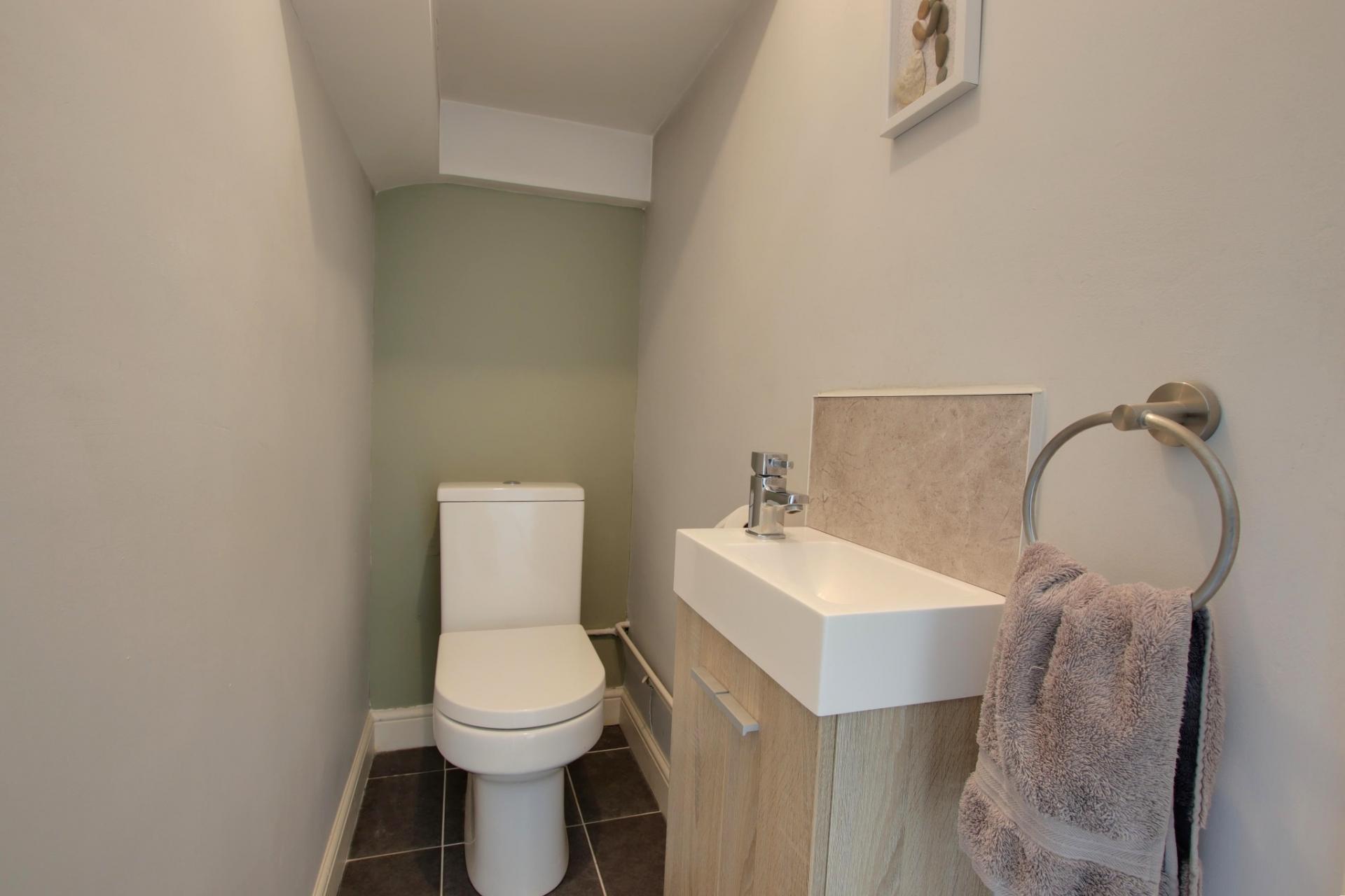 Smooth ceiling. Extractor fan. Low level WC. Wash hand basin. Tiled floor.