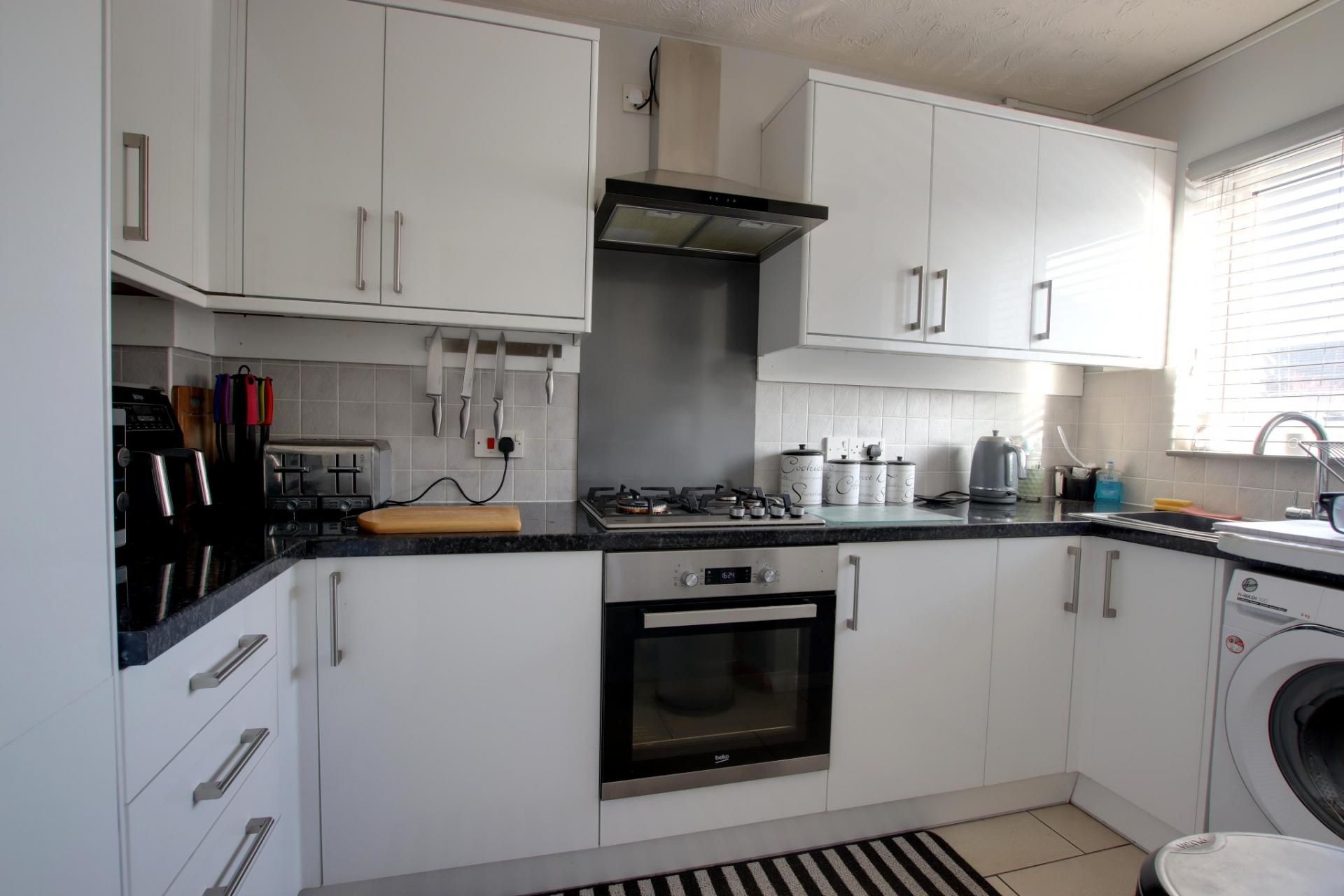 Double glazed window to the front aspect. Modern fitted kitchen with matching wall and base units. Contrasting work tops with splashback. Inset stainless steel sink and drainer. Four ring gas hob with extractor hood above. Fitted oven. Integrated fridge/freezer. Space and plumbing for washing machine. Extractor fan. Radiator. Tiled flooring.