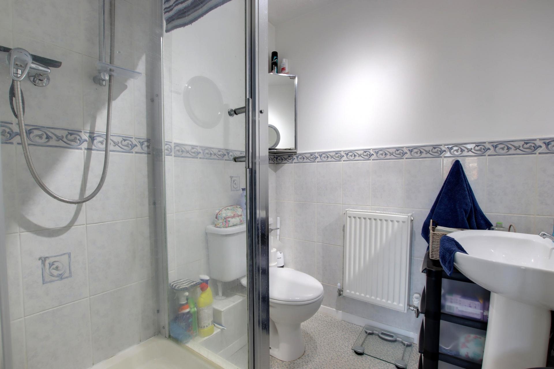 Extractor fan. Suite comprising shower cubicle, wash hand basin and low level WC. Part tiled walls. Radiator. Vinyl flooring.