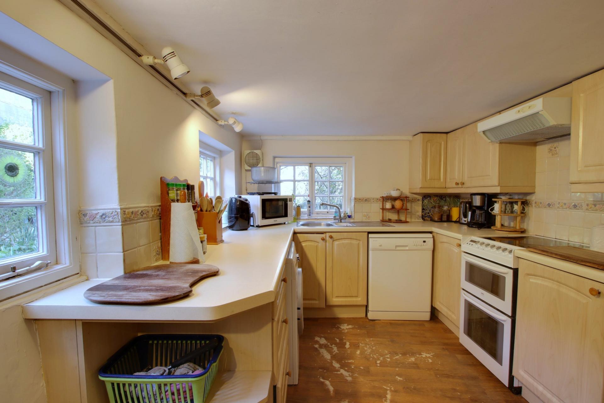 Window overlooking the rear garden and two windows to the side aspect. Smooth ceiling. Matching wall and base units with contrasting work tops. Tiled splash back. Inset stainless steel sink and half drainer. Space for cooker, washing machine and dishwasher. Integrated fridge/freezer. Wood effect laminate flooring.