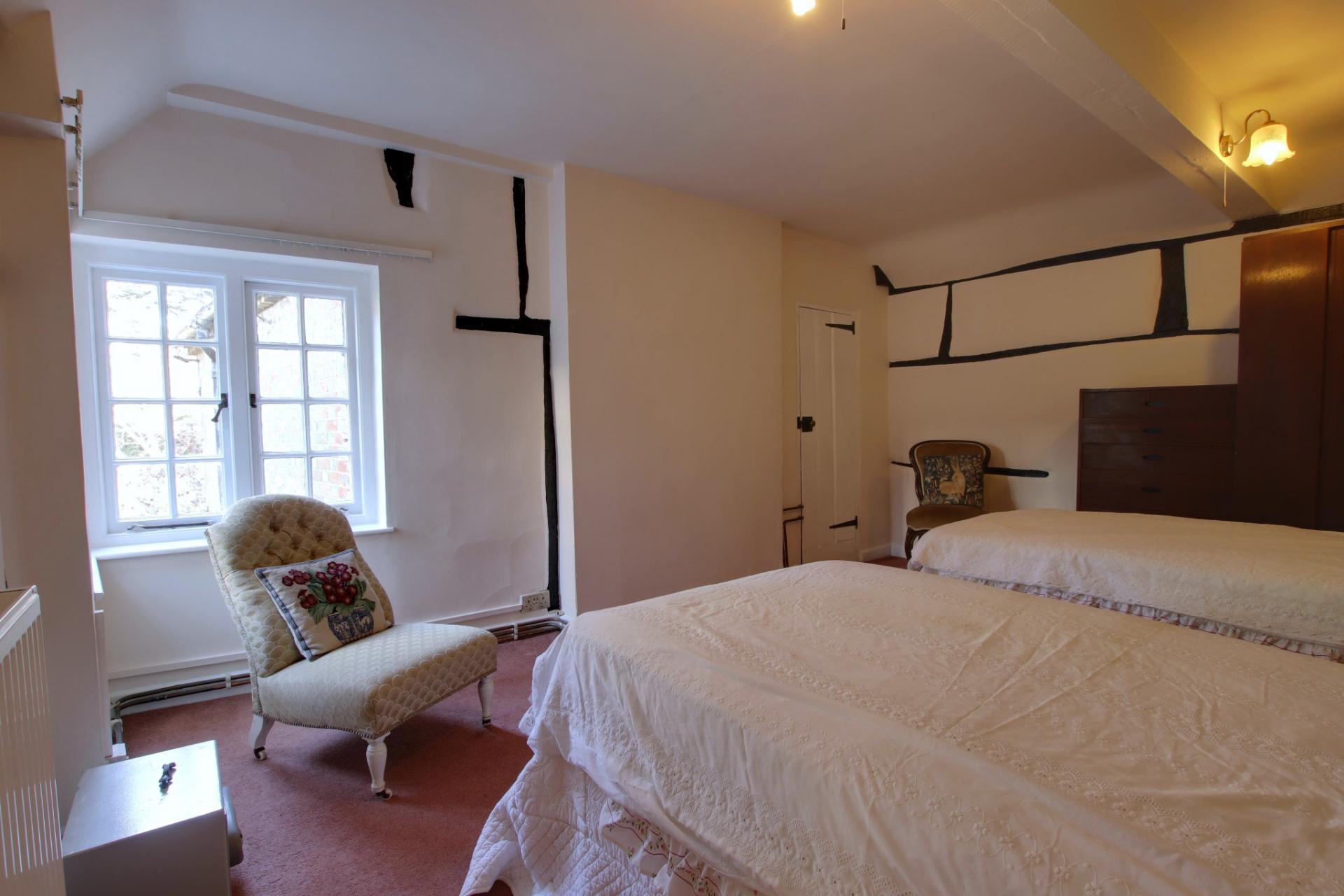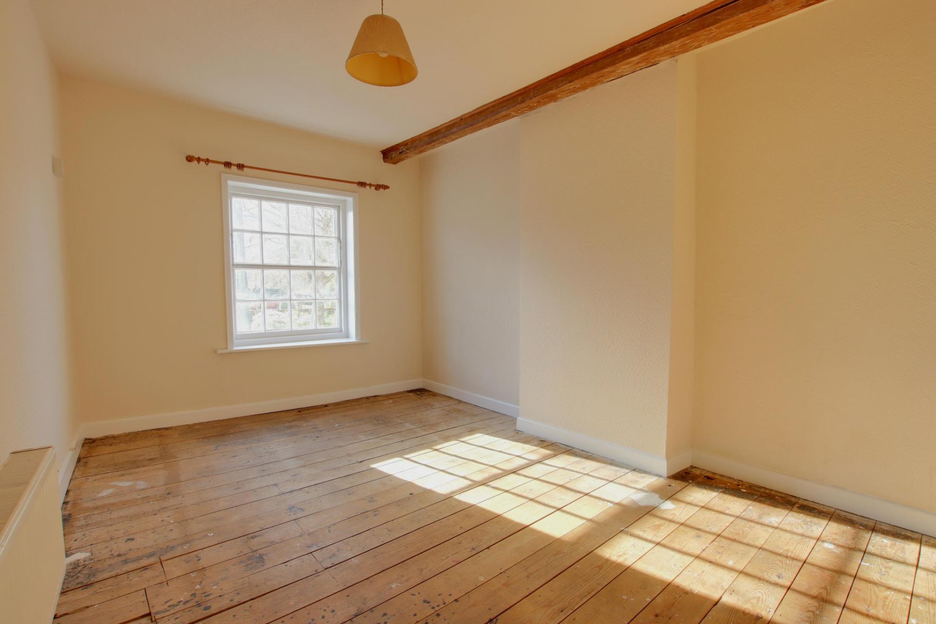 Window to the rear aspect. Exposed beams. Two wall lights. Radiator. Wood effect laminate flooring. Storage cupboard.