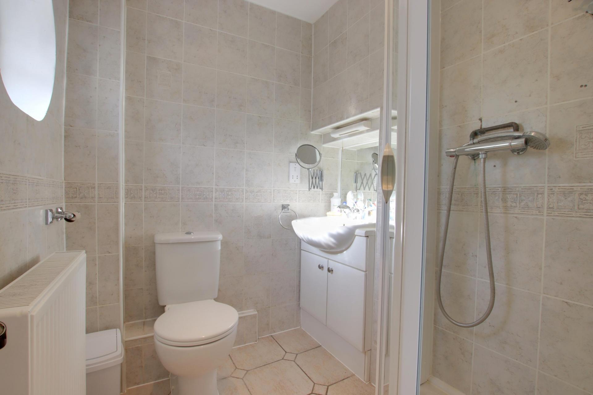 Feature circular window to the front aspect. Smooth ceiling with inset spotlighting. Suite comprising shower cubicle. Wash hand basin. Low level WC. Radiator. Tiled walls and flooring.