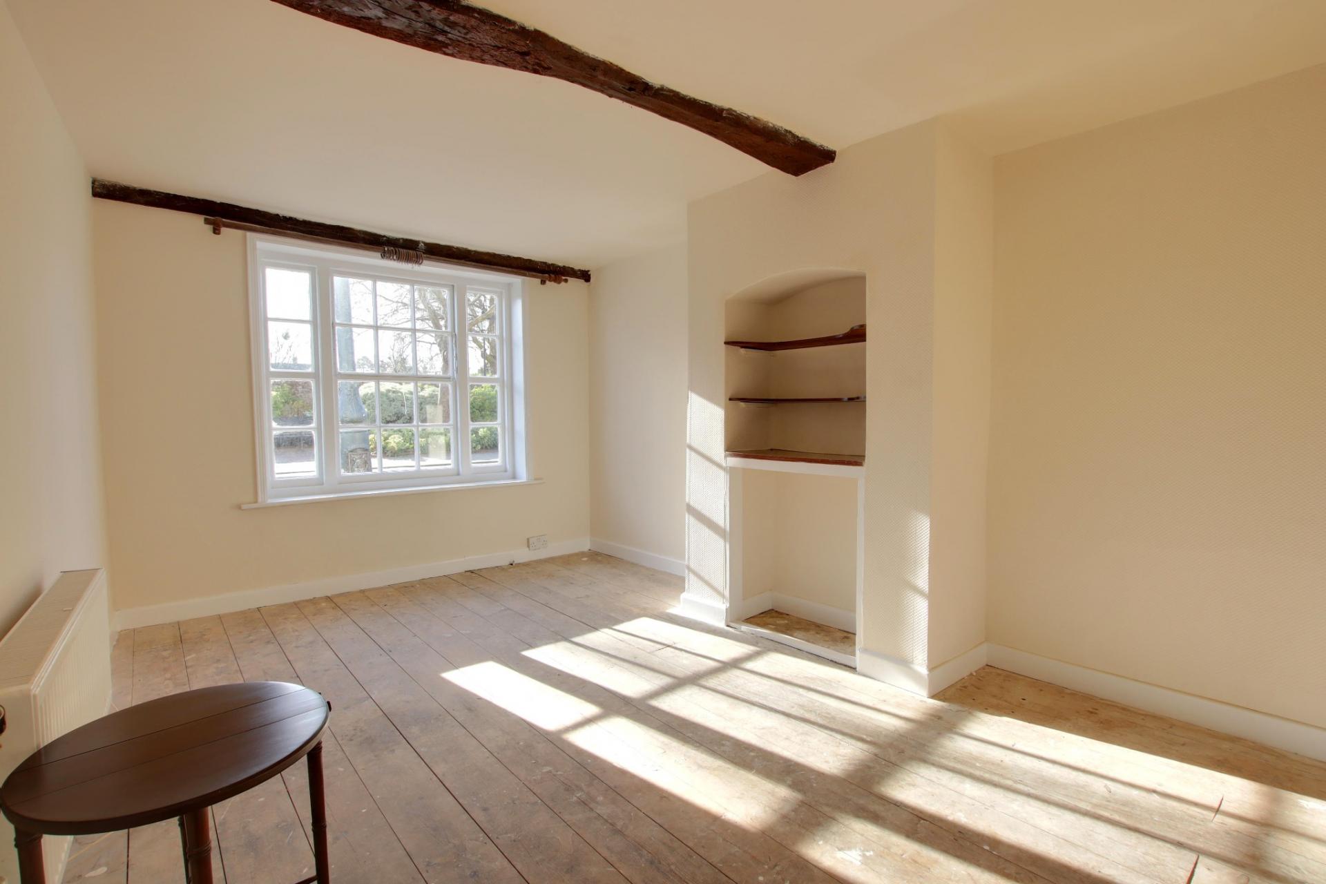 Window to the front aspect. Feature beam. Radiator. Two wall lights. Chimney breast with inset shelving.
