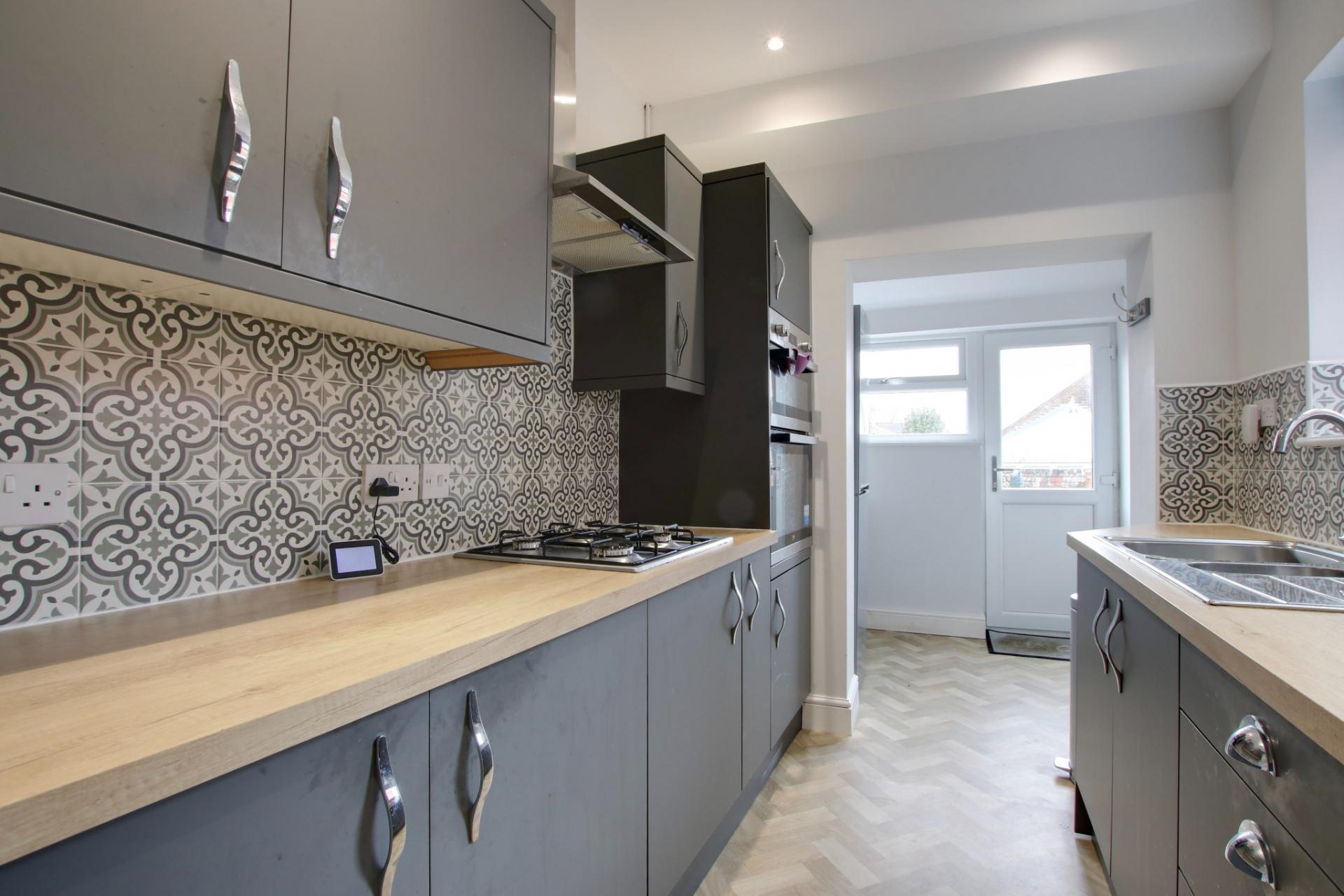 Double glazed window to side elevation with double glazed window and door to rear garden. Refitted kitchen comprising stainless steel single drainer one and a half bowl sink unit with cupboard under. Further range of wall and base level units with wood effect work surface over and splash back tiling. Built-in four ring gas hob with cooker hood over. Built-in eye-level double oven and grill with cupboards under and over. Plumbing for washing machine. Fridge/freezer to remain. Two radiators. Inset ceiling spotlights.