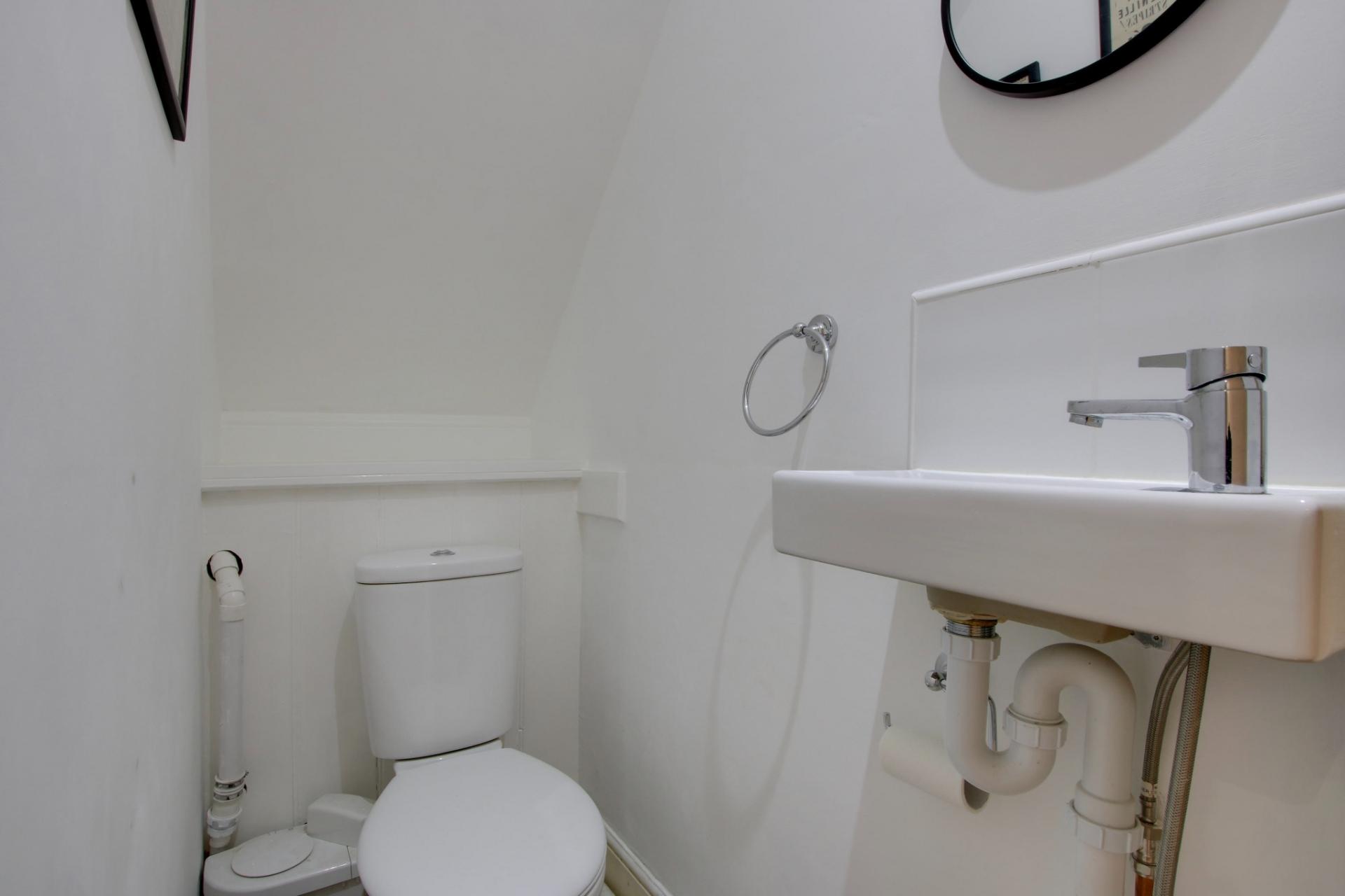 Macerator toilet. Wash hand basin. Splash back tiling.