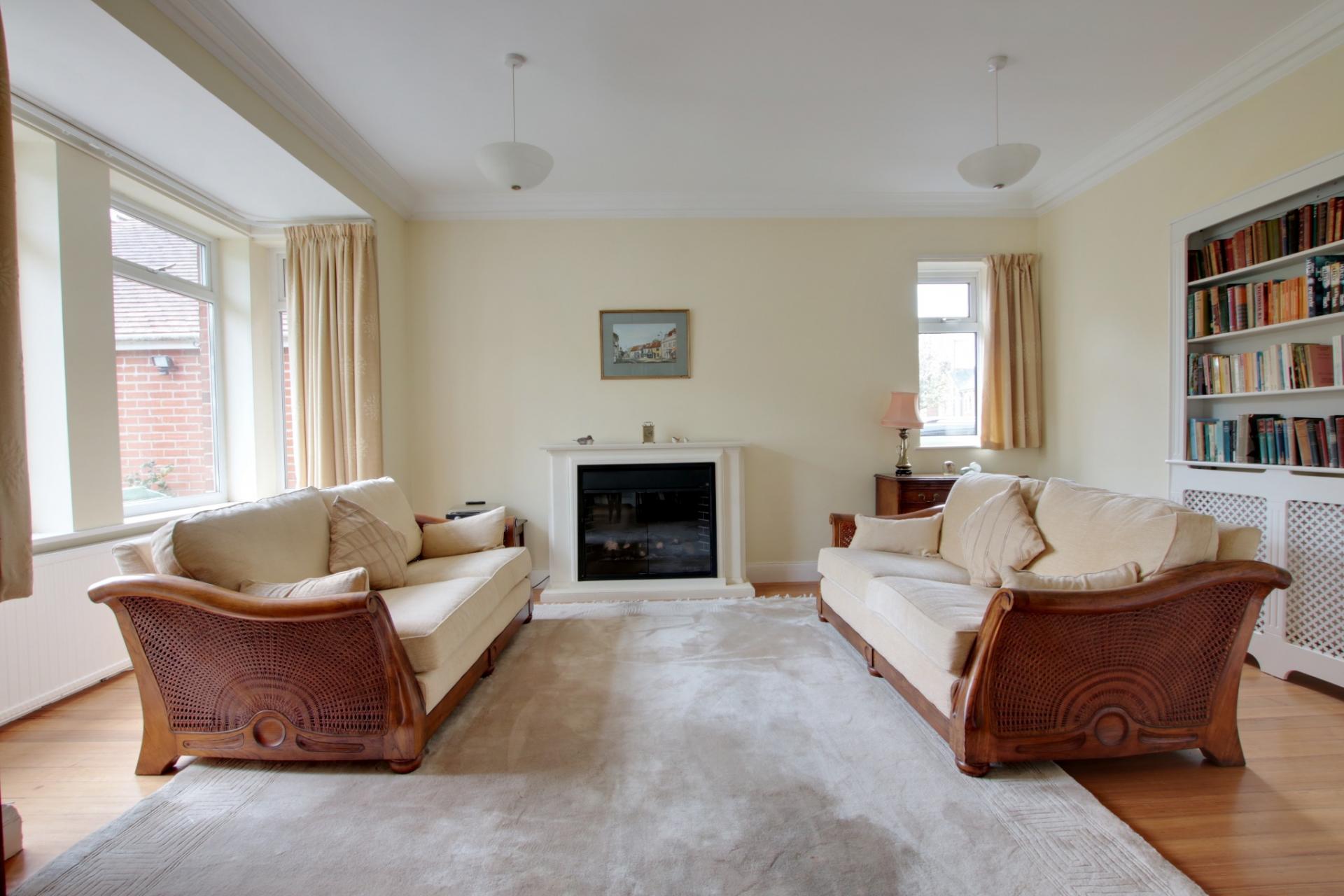 An impressive room with double glazed bay window to rear elevation and double glazed window to side elevation. Double glazed French doors leading to conservatory. Ornate coving. Wooden flooring. Three radiators, two with decorative covers incorporating bookshelves above. Further storage cupboard. Door to: