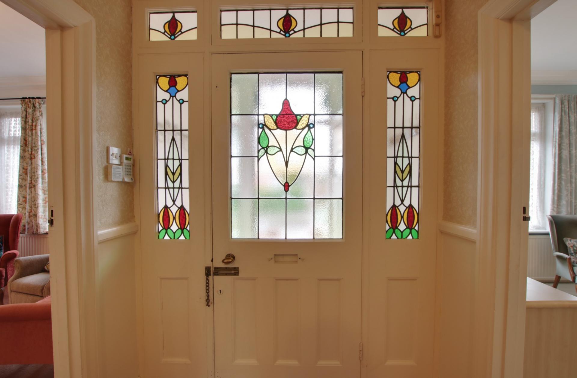 Quarry tiled floor. Stained glass door with stained glass side panels leading to: