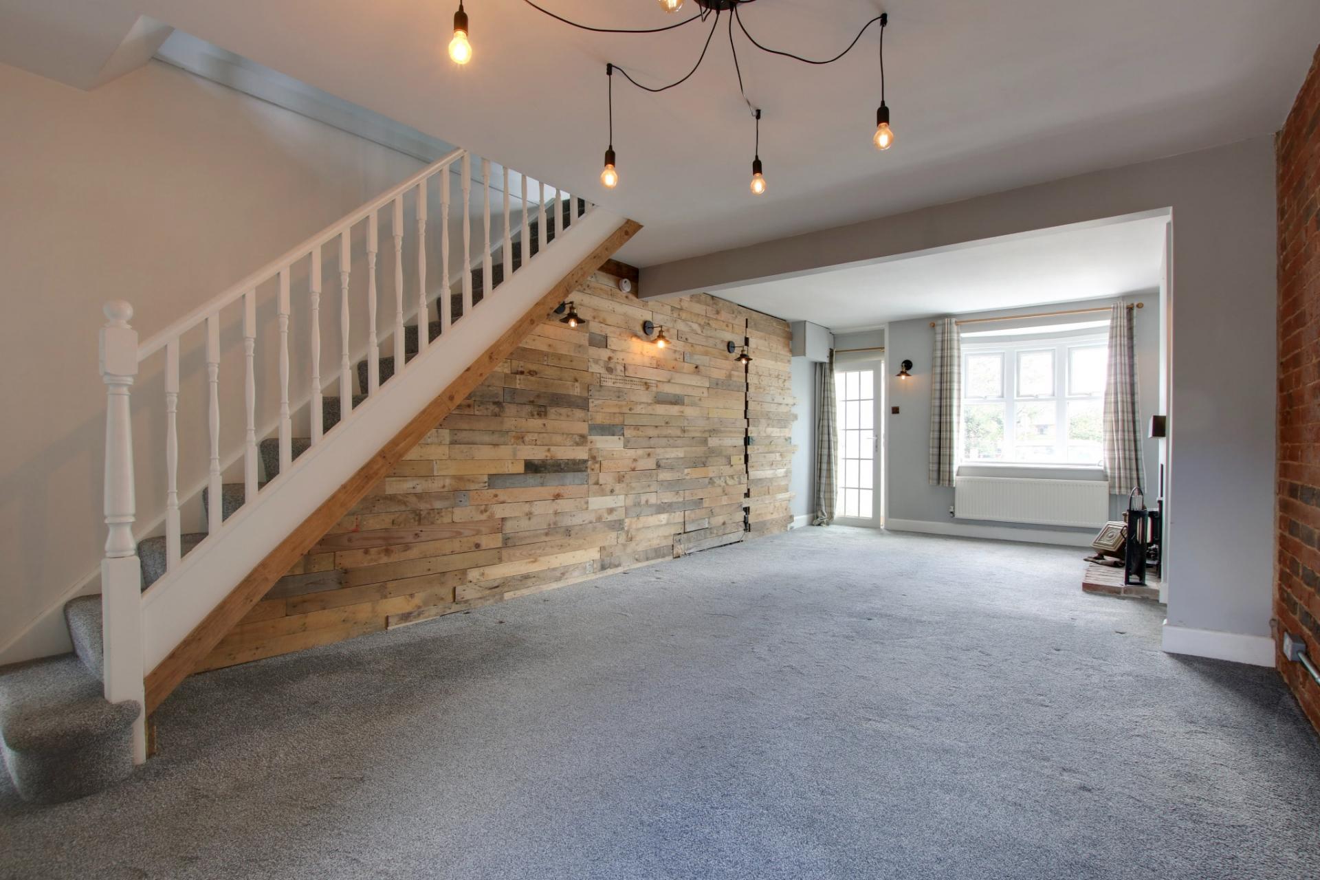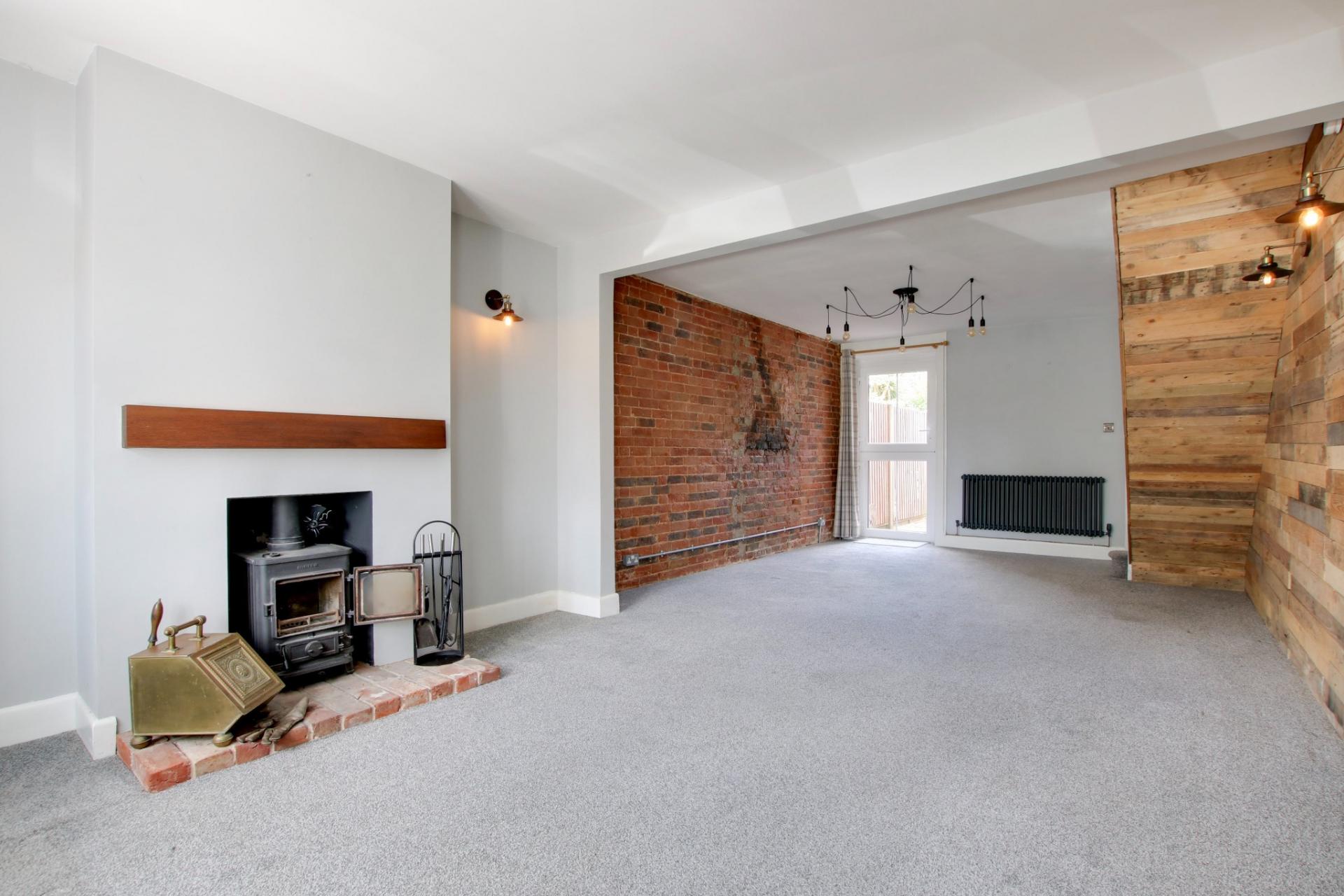 Open plan lounge/diner with double glazed windows to front elevation and double glazed stable door leading to garden. Chimney breast with multi-fuel stove with brick hearth and wooden mantel open. Feature exposed brick wall to one side of dining area and reclaimed wood panelling to the other. Stairs to first floor. Door to:
