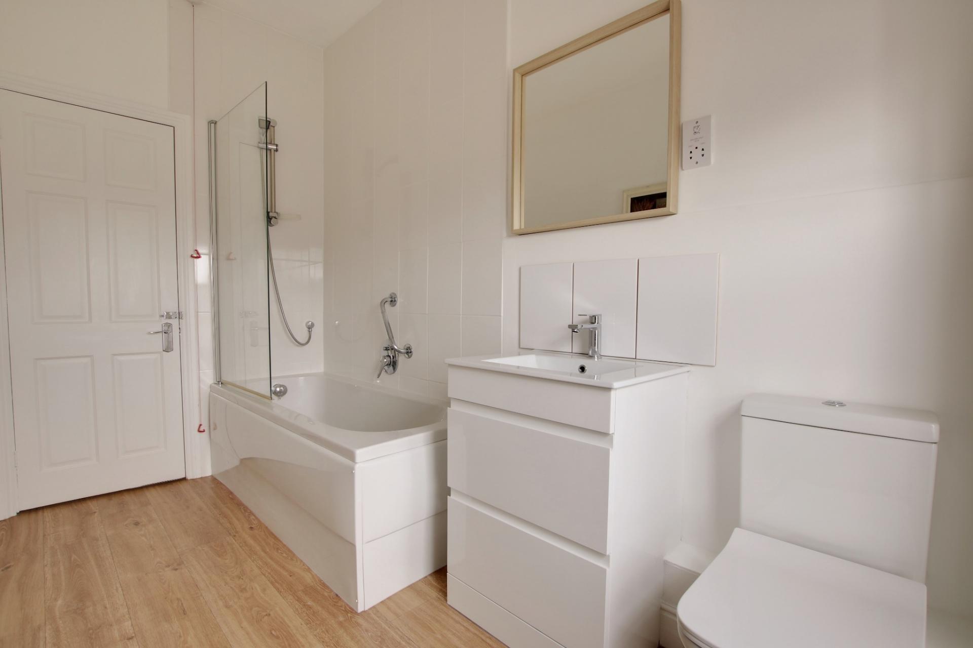 Sash window to rear elevation with obscure glass. Panel enclosed bath with shower unit over and shower screen. Vanity unit with wash hand basin and storage drawers beneath. Low level close coupled WC. Radiator. Electric shaver point. Part tiled walls.