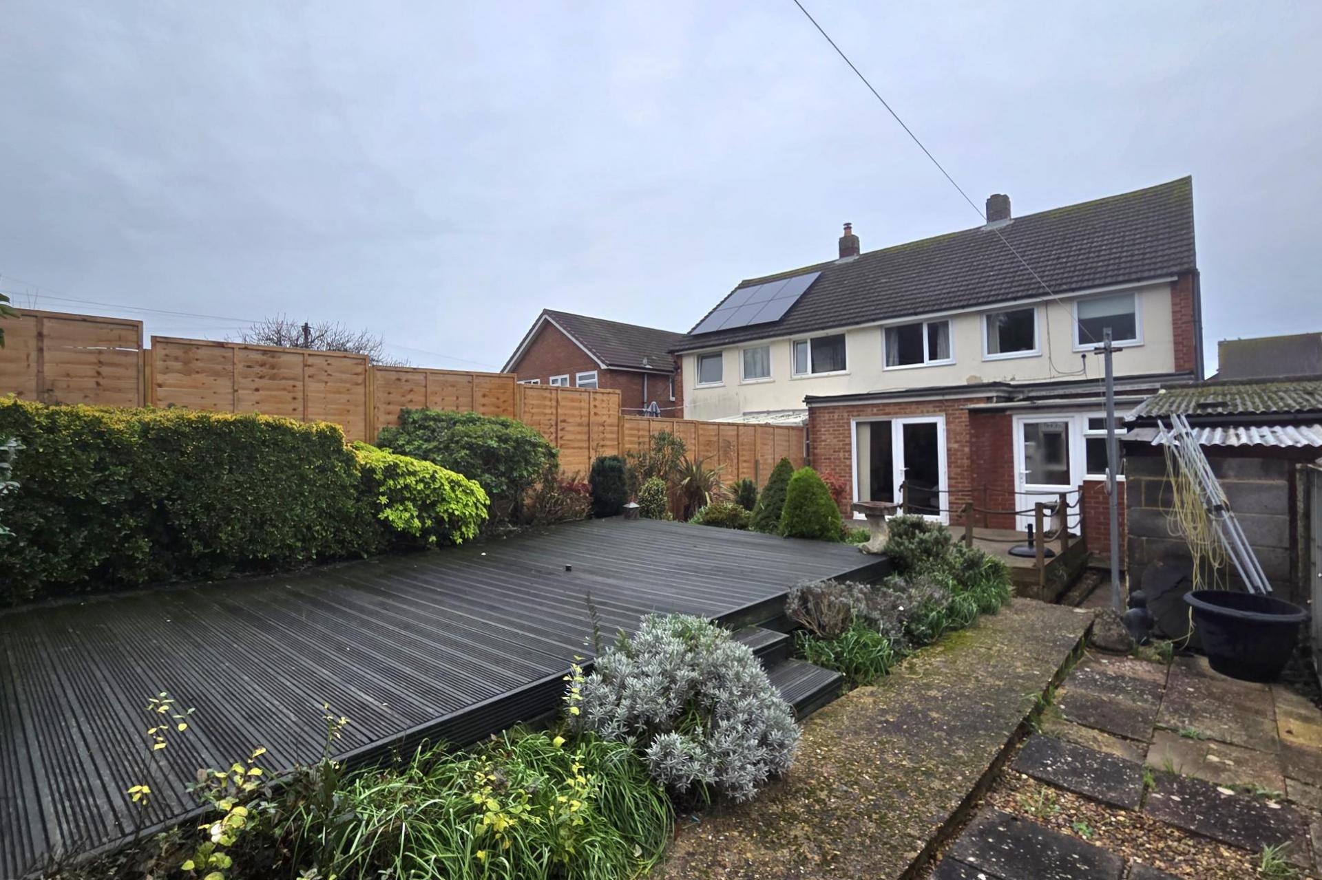 The enclosed rear garden has an initial patio area and a couple of raised decked areas. Shrubs and borders. Outside tap. Greenhouse and additional paved seating area at the top of the garden.