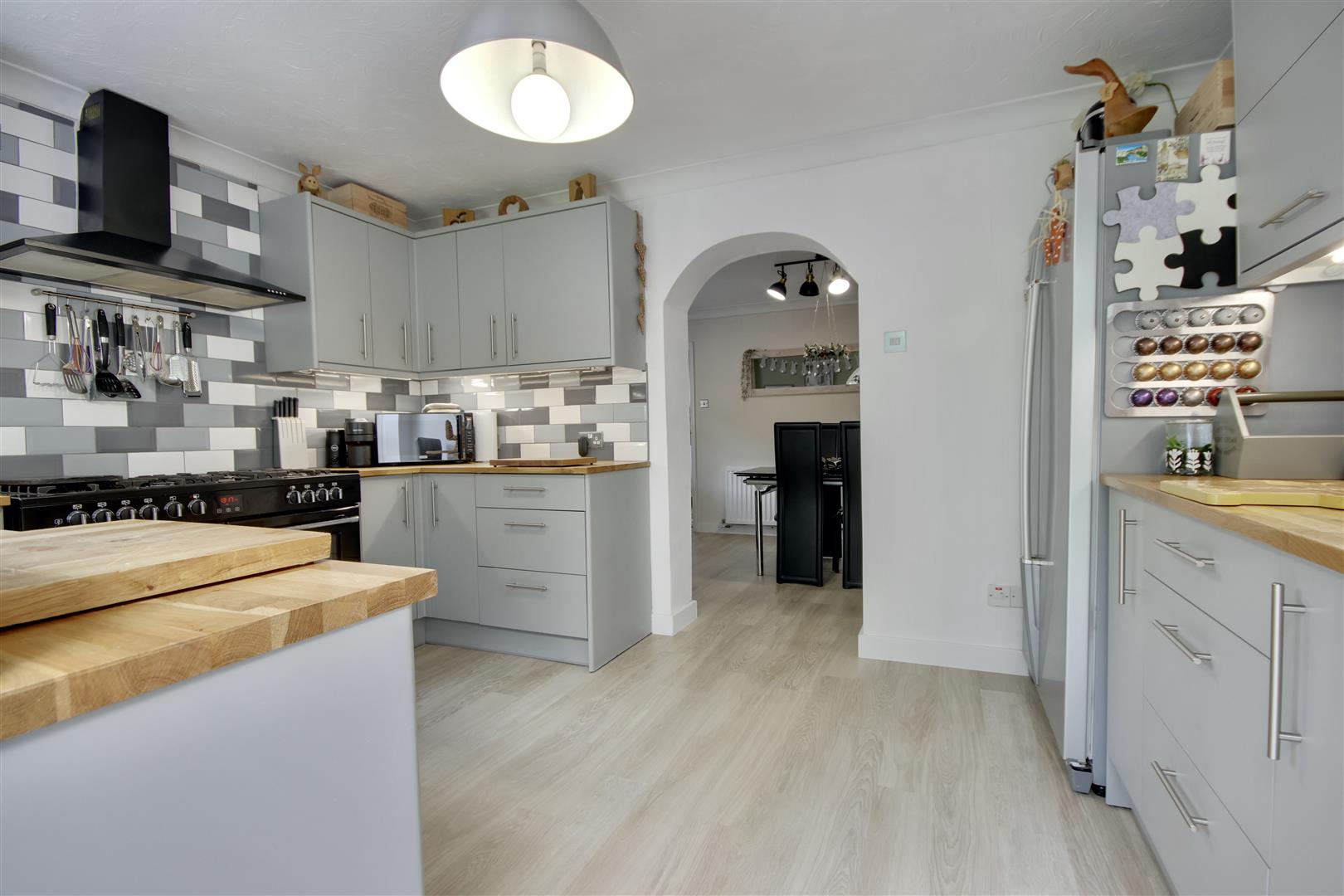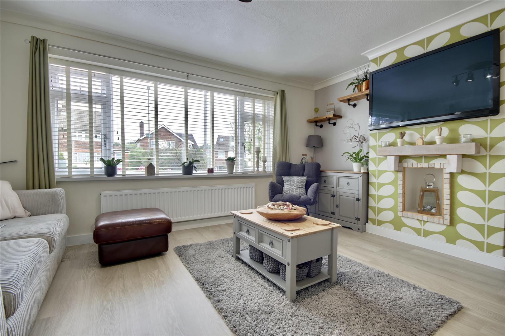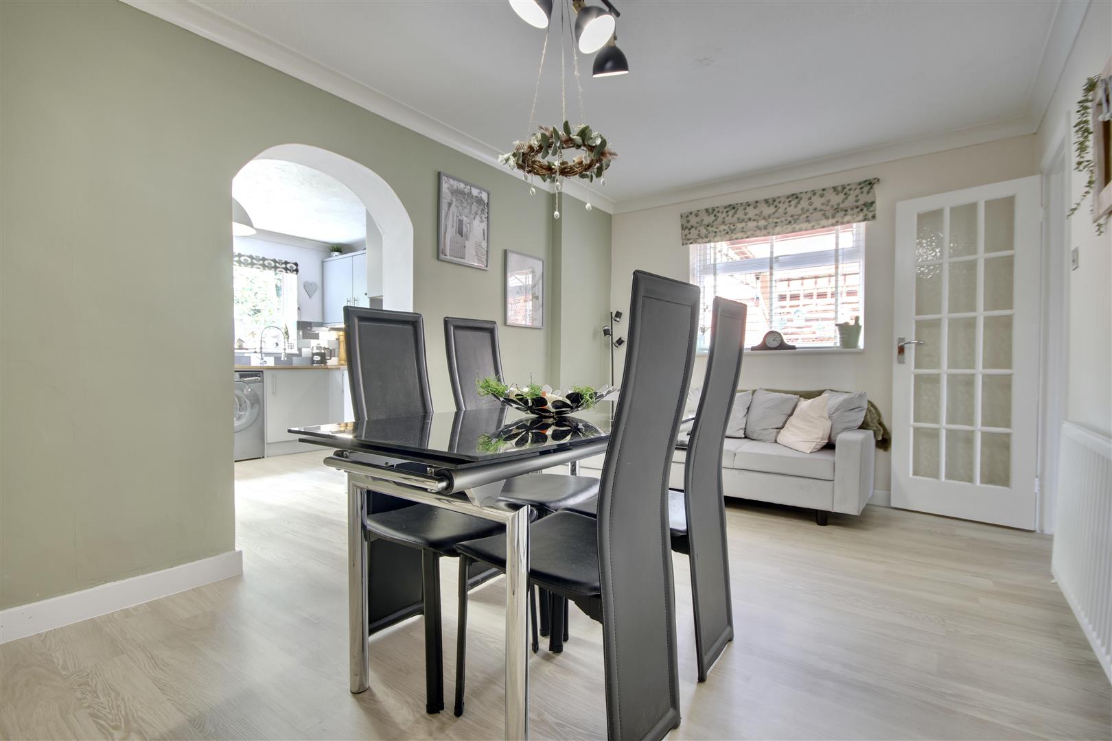 To the front, a spacious driveway provides off-road parking for up to three vehicles. Step inside, and you're welcomed by a tastefully decorated interior throughout. The front lounge is a warm and inviting space, featuring a charming fireplace and plenty of room for seating and furniture. At the heart of the home is the separate dining room, ideal for entertaining or relaxing, with space for a dining set and sofa. This flows into the modern kitchen at the rear, offering ample cupboard space, integrated appliances, and direct access to the garden.