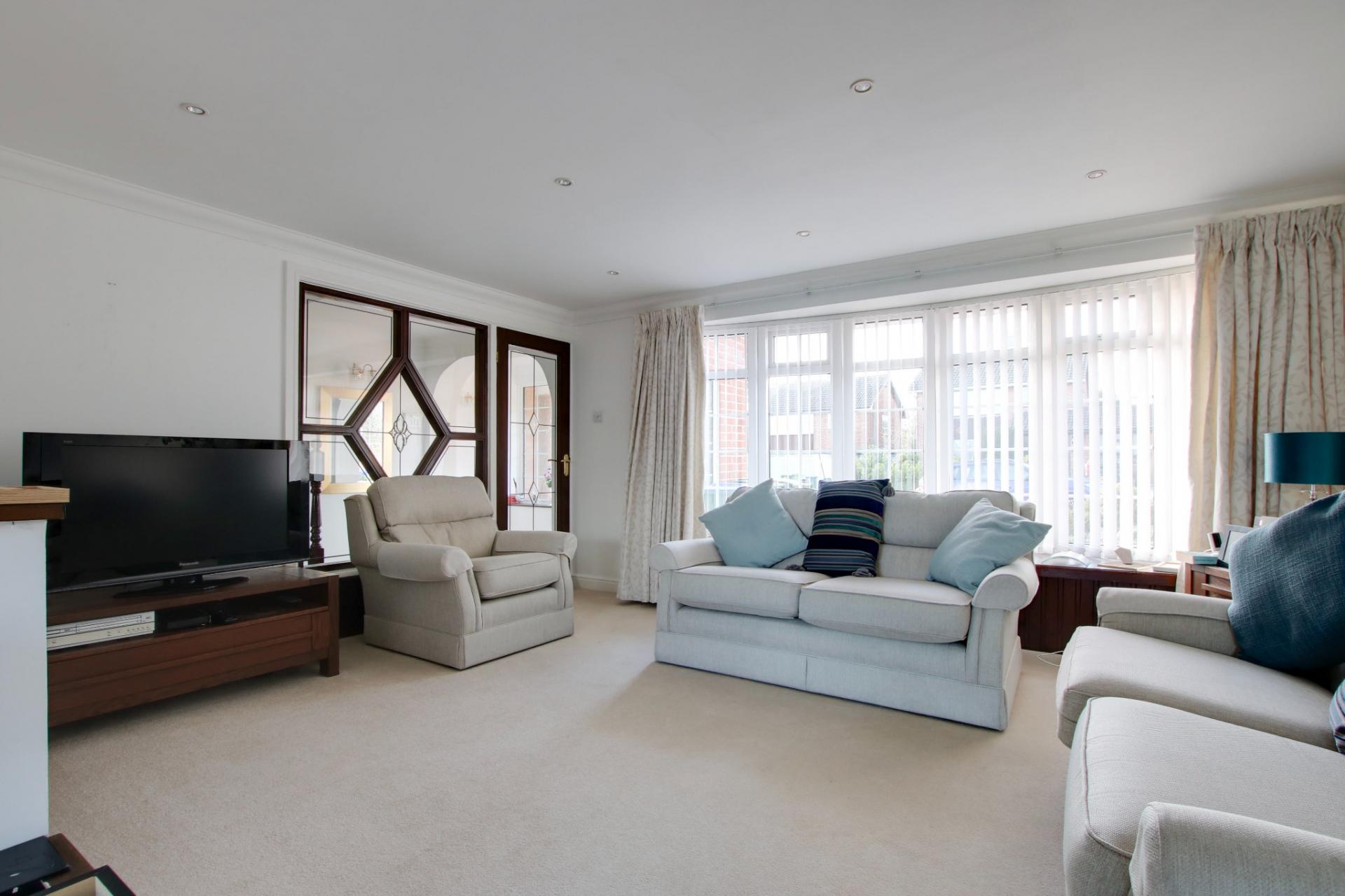 Dual aspect room with double glazed bow window to front elevation and double glazed patio doors to garden. Chimney breast with log effect 'Dimplex' electric fire. Two radiators. Inset ceiling spotlights. Coved and skimmed ceiling. Door to kitchen.
