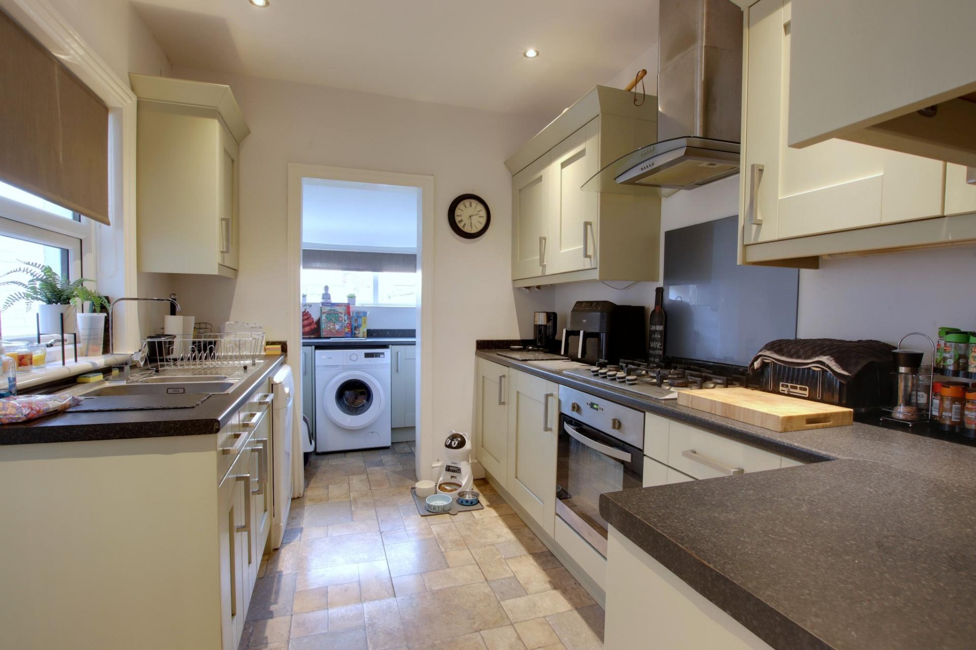 Double glazed window to the side aspect. Double glazed obscure door leading to the rear garden. Smooth ceiling. Inset spotlighting. Modern fitted kitchen with matching wall and base units with inset stainless steel 'Franke' sink and half drainer with contrasting worktops. Five ring 'Lamona' gas hob with extractor hood above and integral oven/grill. Freestanding dishwasher to remain. Cupboards and drawers with soft close. Under unit lighting. Tile effect laminate flooring. Opening to: