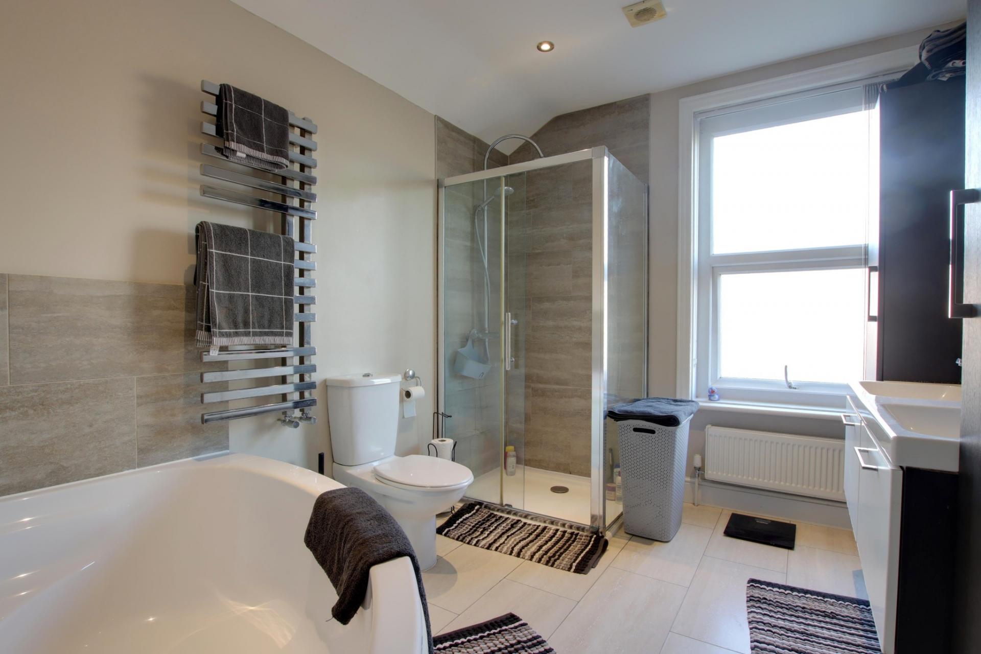 Double glazed obscure window to the rear aspect. Smooth ceiling with inset spotlighting. Extractor fan. Modern fitted suite comprising; shower cubicle with monsoon shower head and hand shower, corner bath, low level WC and twin wash hand basins within vanity units and storage cupboard. Heated towel rail and radiator. Part tiled walls. Tiled flooring.