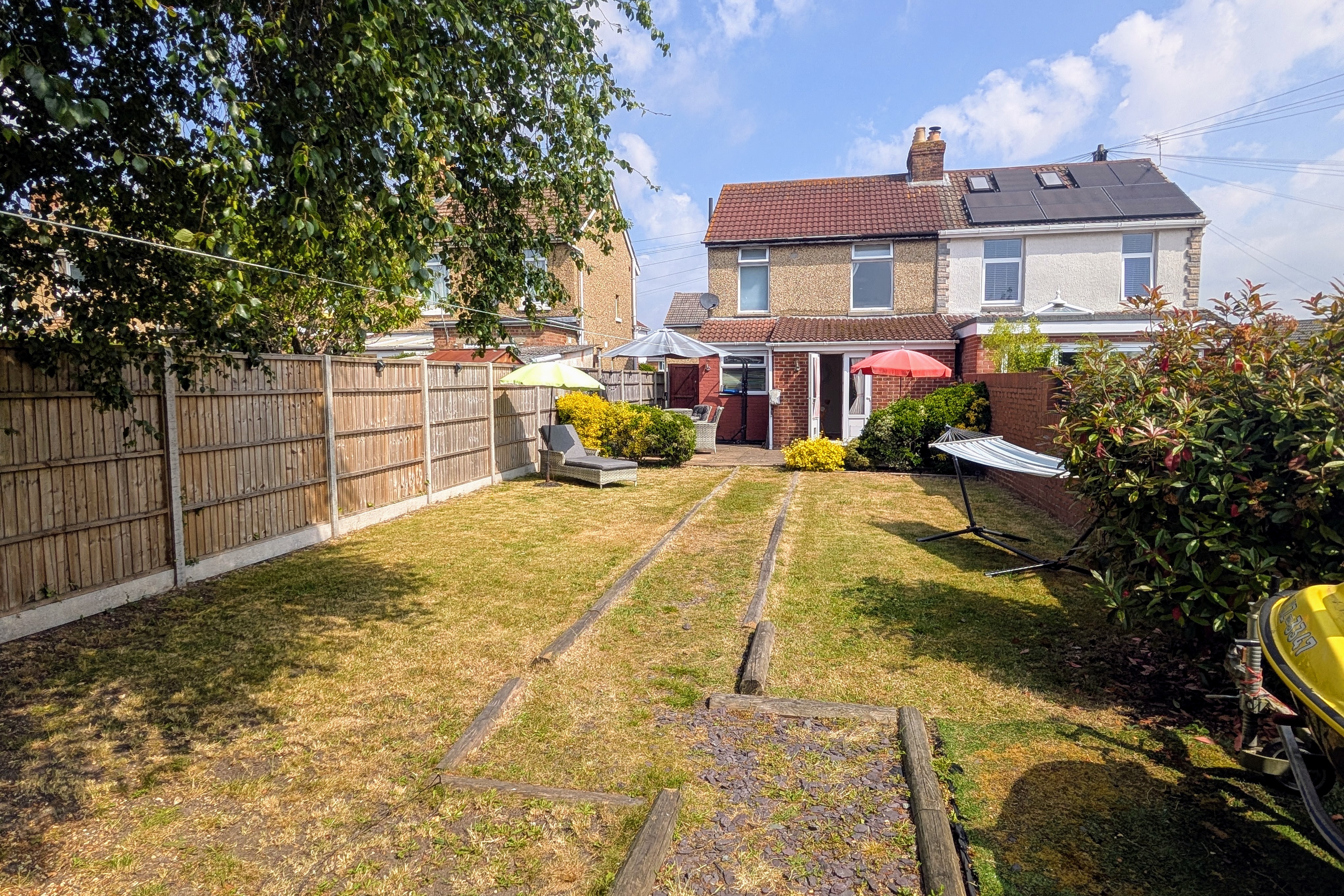 The private aspect rear garden has the benefit of backing onto Park Lane Recreation Ground. It has an initial paved area with the remainder of the garden predominantly being laid to lawn with shrubs and borders and seating area at the bottom of the garden.