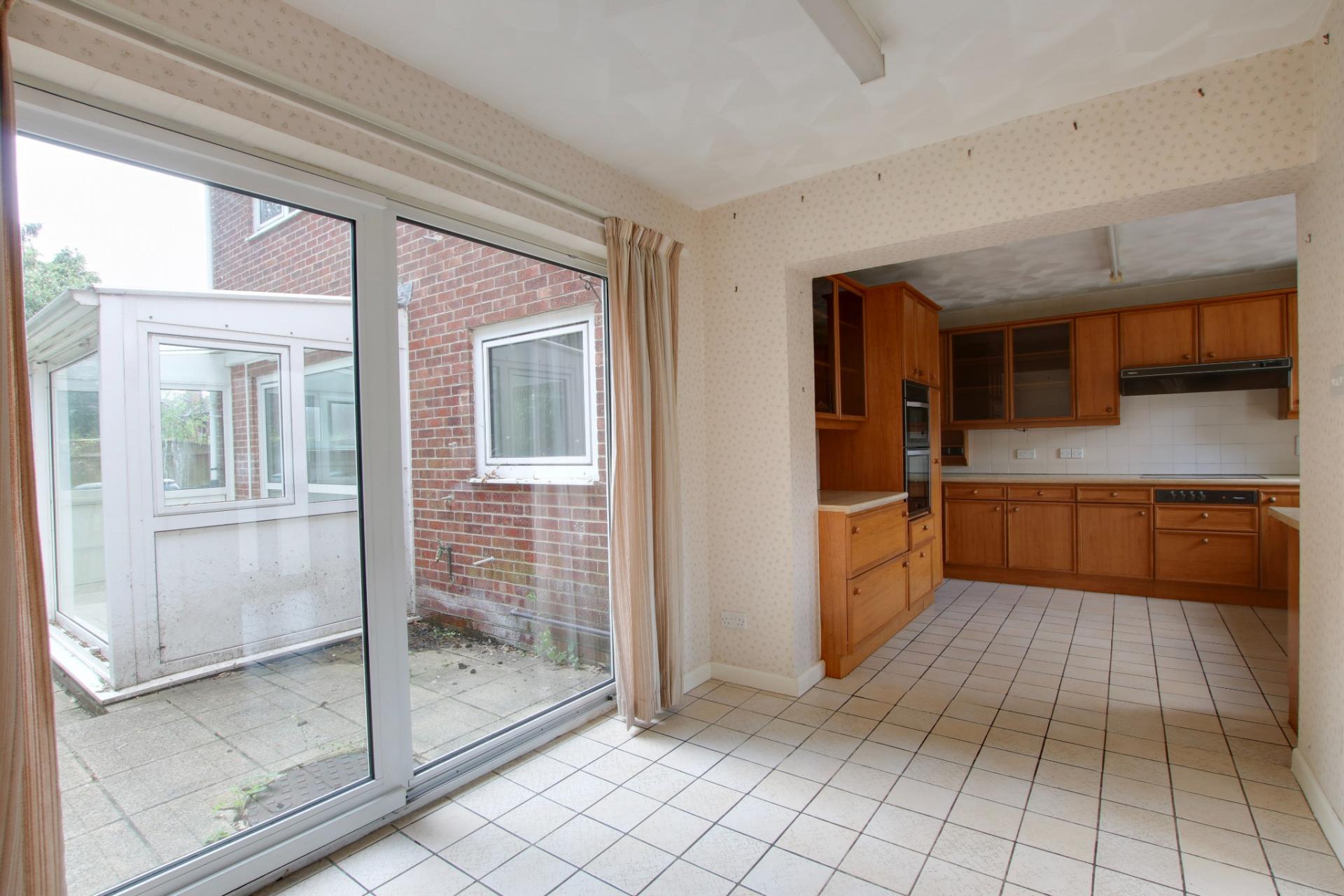 Two double glazed windows to side elevation. Double glazed patio doors to garden. Kitchen area with stainless steel double drainer sink unit with cupboard under. Further range of wall and base level units with roll edge work surfaces over and splash back tiling. Built-in four ring ceramic hob with cooker hood over. Built-in double oven and grill with cupboards under and over. Plumbing for dishwasher. Tiled flooring. Area for breakfast table. Door to rear lobby and door to utility room.