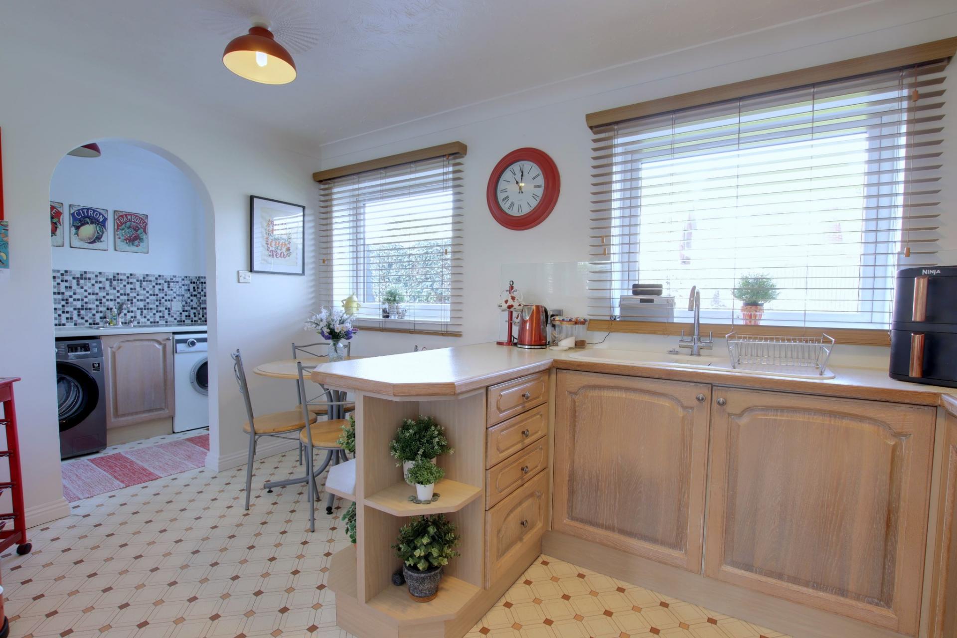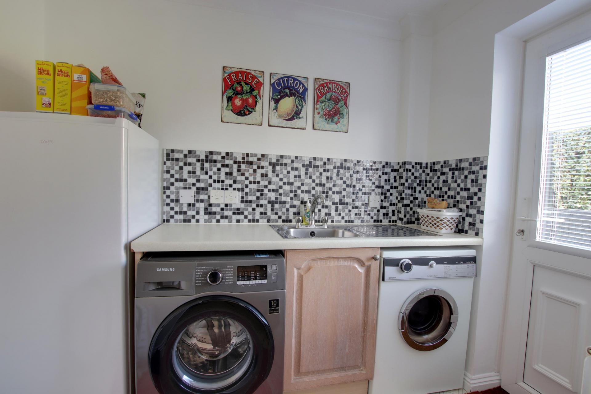 Double glazed door leading to the rear garden. Low level units with inset stainless steel sink and drainer with contrasting worktops. Tiled splashback. Space for fridge/freezer, washing machine and tumble dryer. Radiator.