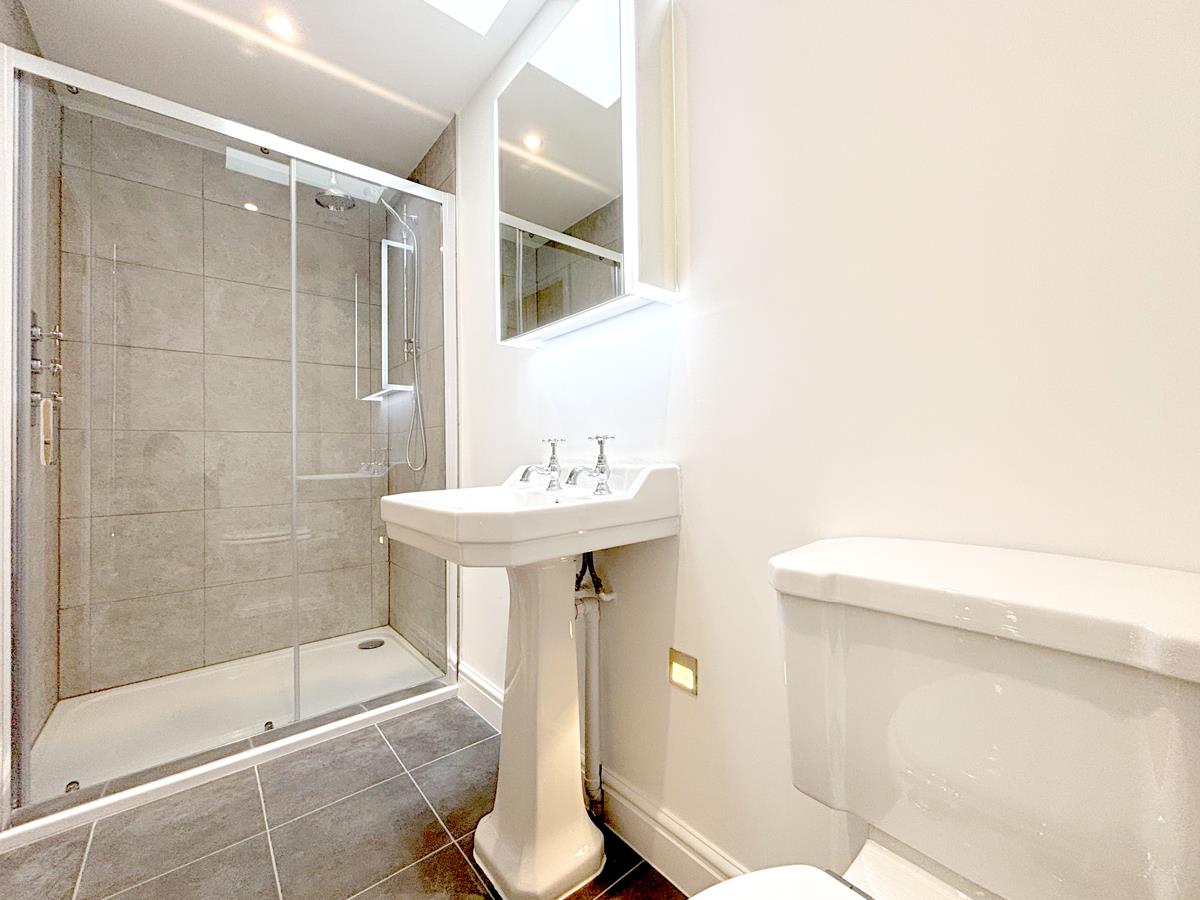 En-Suite - 3.05m x 0.94m (10' x 3'1") - With tiled floor, low level w.c., pedestal wash hand basin with blue tooth mirror and light over with useful integrated storage. Tiled cubicle housing domestic hot water shower with drench head and wand. Chrome effect electric heated towel rail, automatic low level courtesy lighting and Velux style window and extractor.