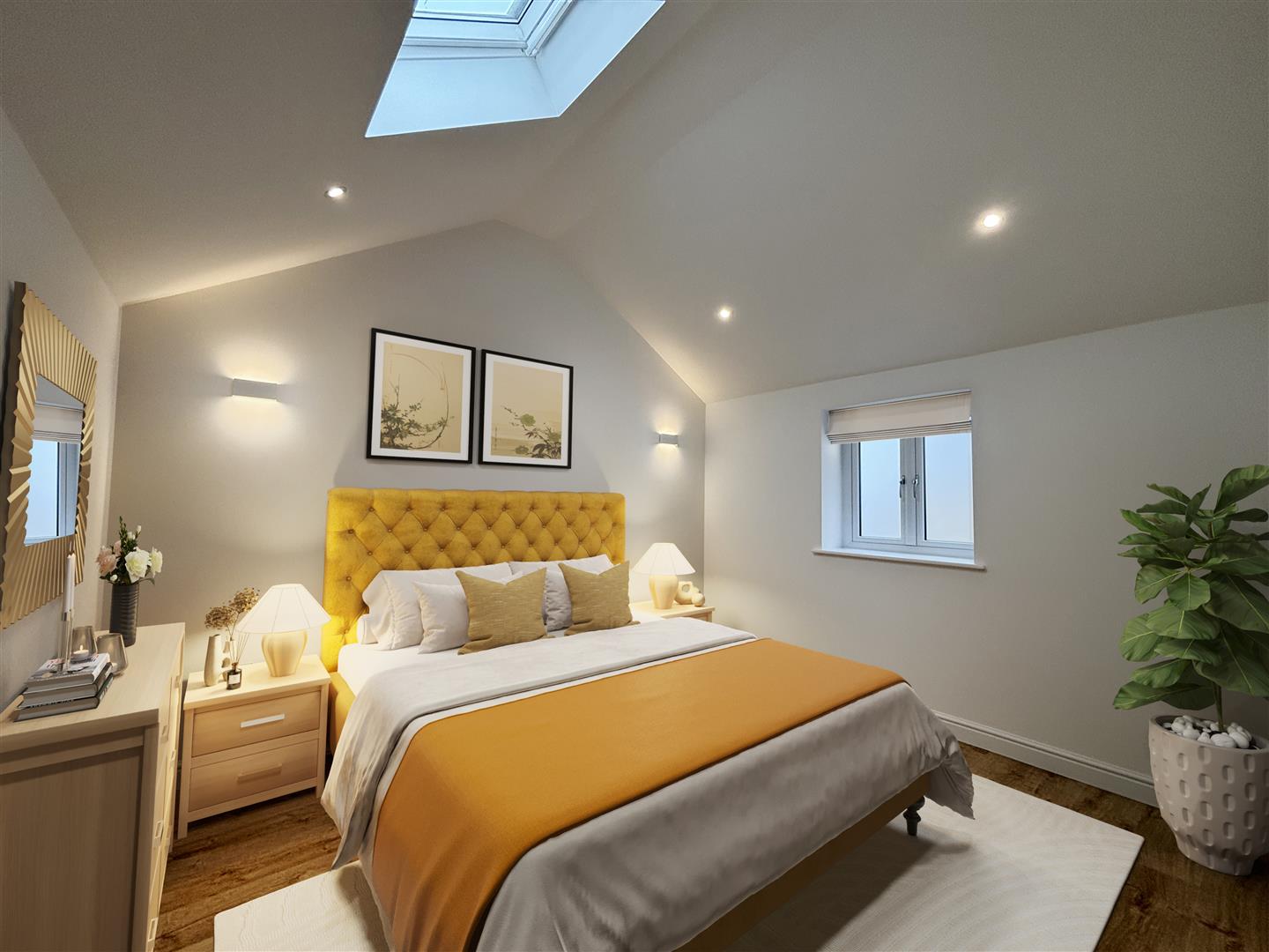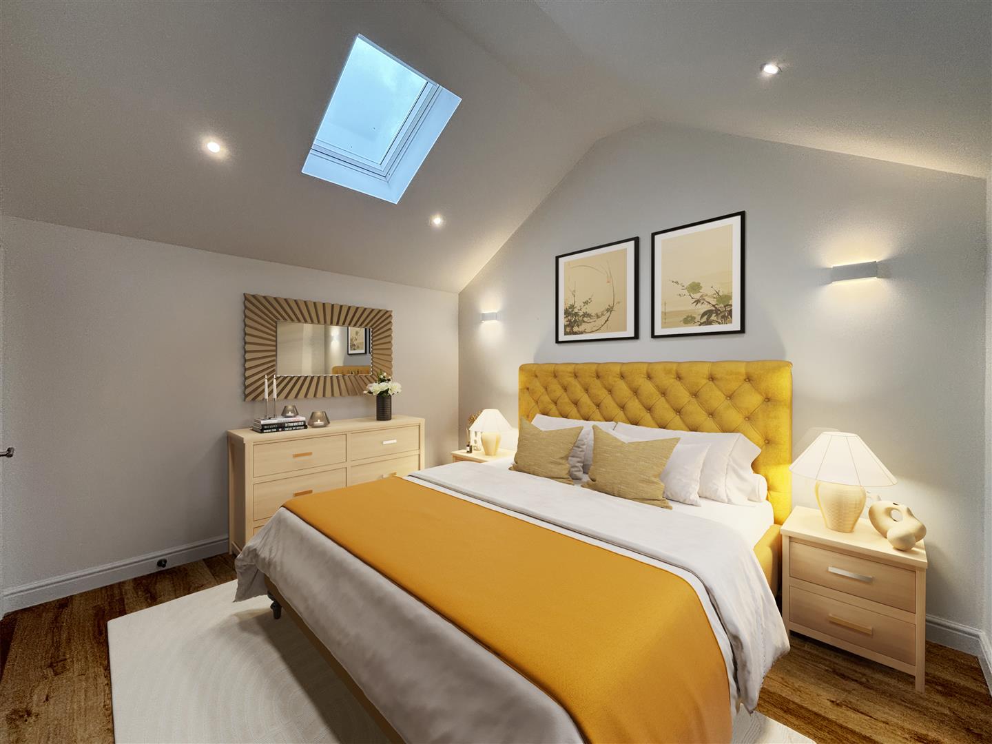 Master Bedroom - 3.84m x 3.07m (12'7" x 10'1") - With hard flooring, frosted window to the front and vaulted ceiling with Velux style window, recessed LED lights as well as two attractive dimmable wall lights and a door to the en-suite.
