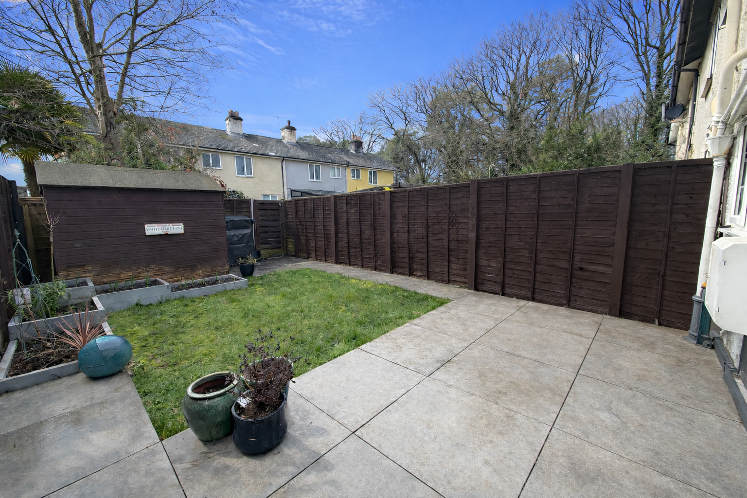 The remainder of the garden is laid to lawn, with a pathway leading to the rear where a garden shed is conveniently situated.