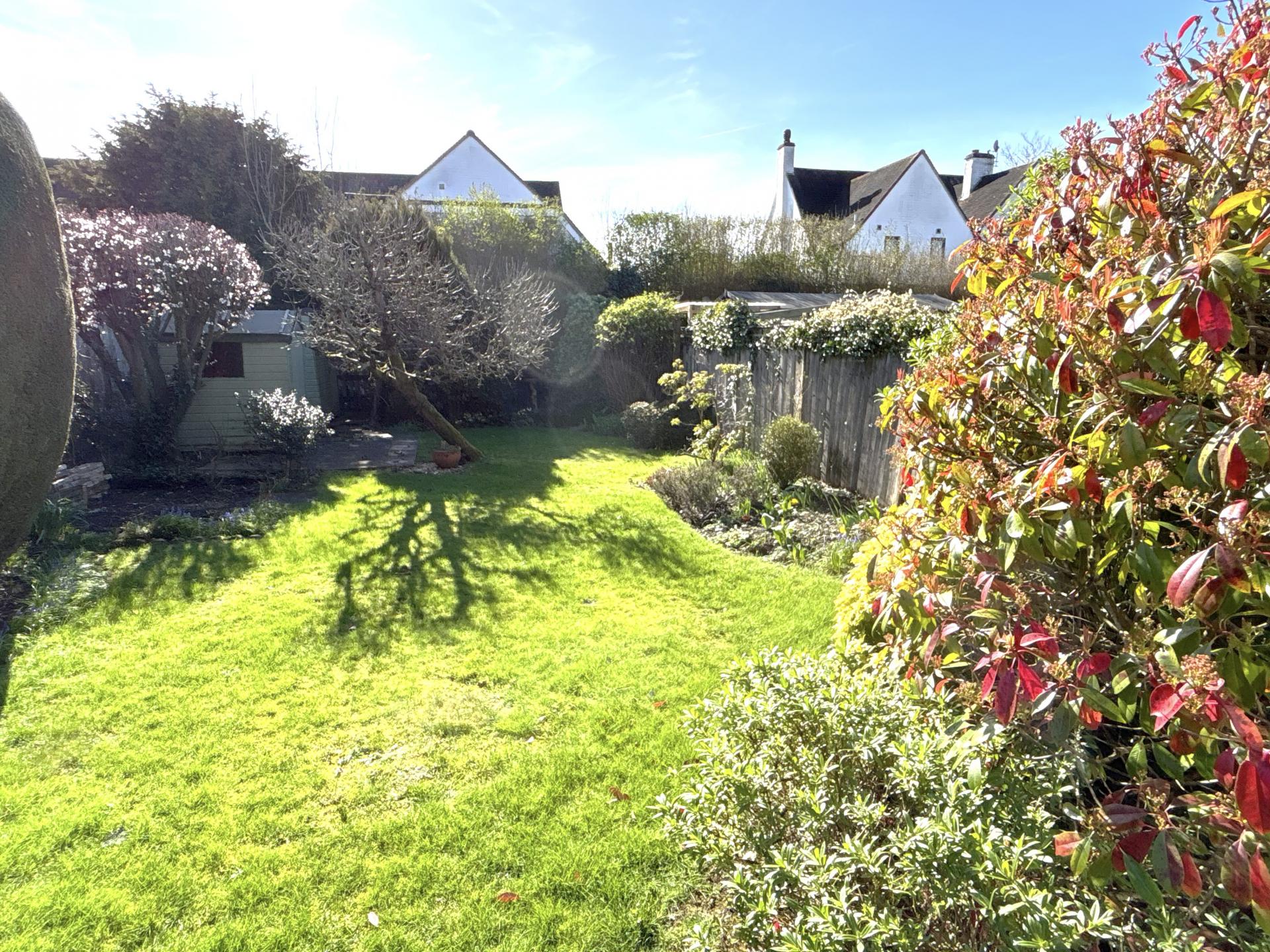 Rear Garden. Southerly facing and mainly laid to lawn with patio area, timber shed and side access, selection of well stocked and mature flower beds and trees.