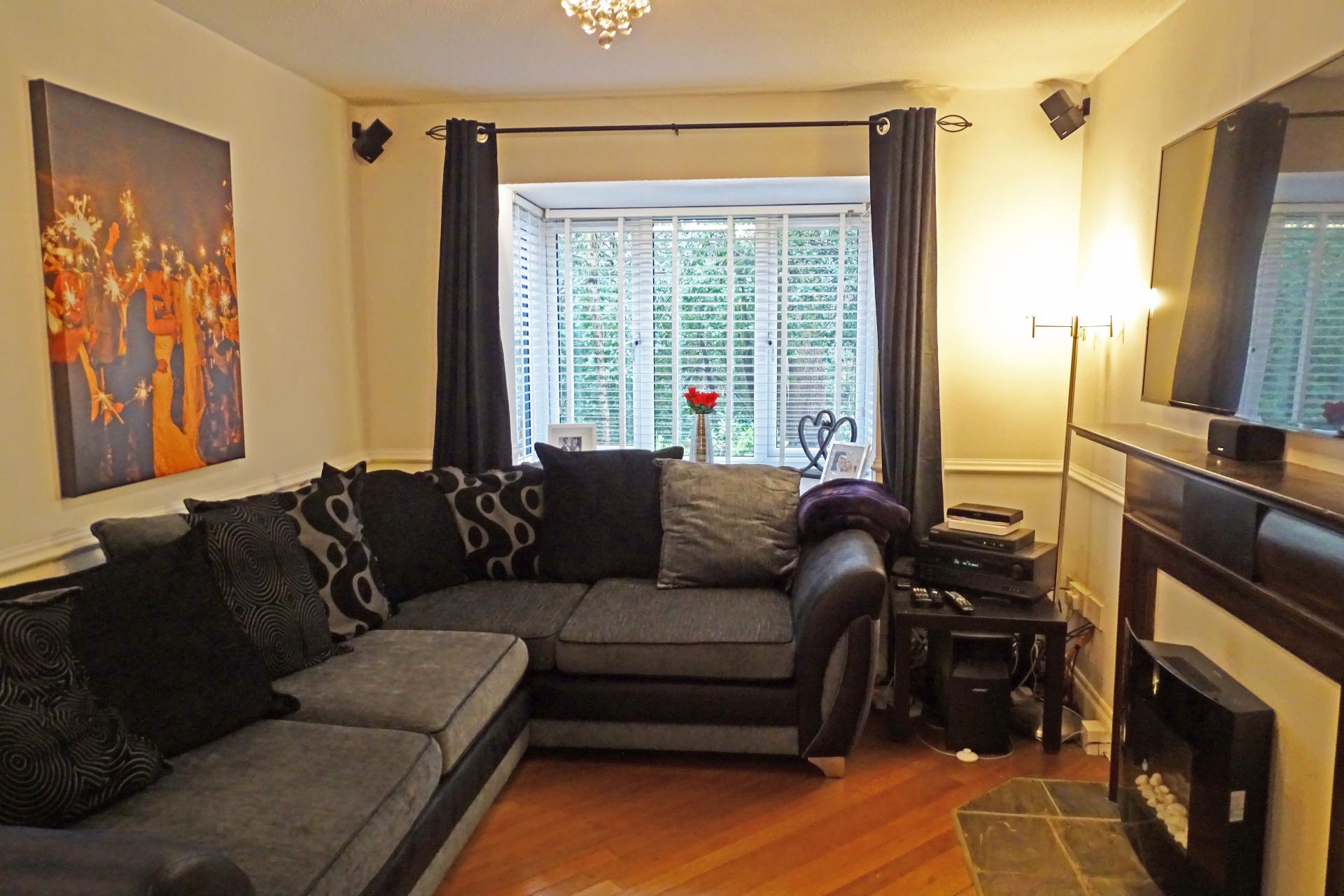 Approached over a courtesy porch, the front door leads to an inner Hallway with two storage cupboards and leads through to the L shaped Living / Dining Room with feature fireplace and bay window overlooking the woods beyond. An archway leads to the Kitchen with a range of floor and wall mounted units with space and plumbing for washing machine, slimline dishwasher, electric cooker and fridge freezer.