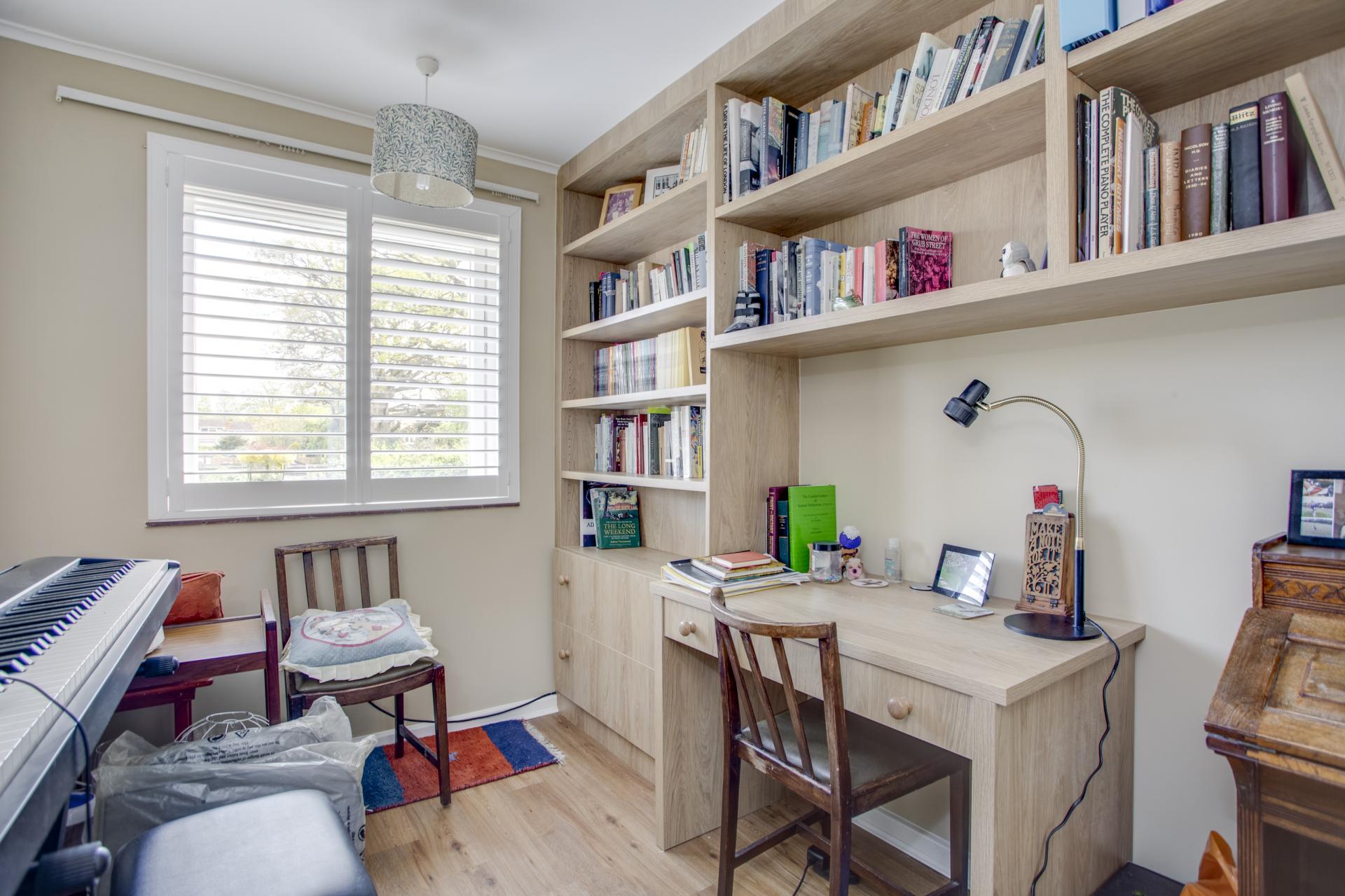 Upstairs there are three bedrooms all served by a new family Bathroom, Bedroom One is a good size double room, it has recently been decorated and recarpeted and has two fitted wardrobe cupboards. Bedroom Two, also a double room has a fitted wardrobe cupboard and Bedroom Three is currently set up as a study with a bespoke Neville Johnson fitted furniture to include a desk, shelving and fitted shutters. There are also new carpets fitted to the staircase and landing.