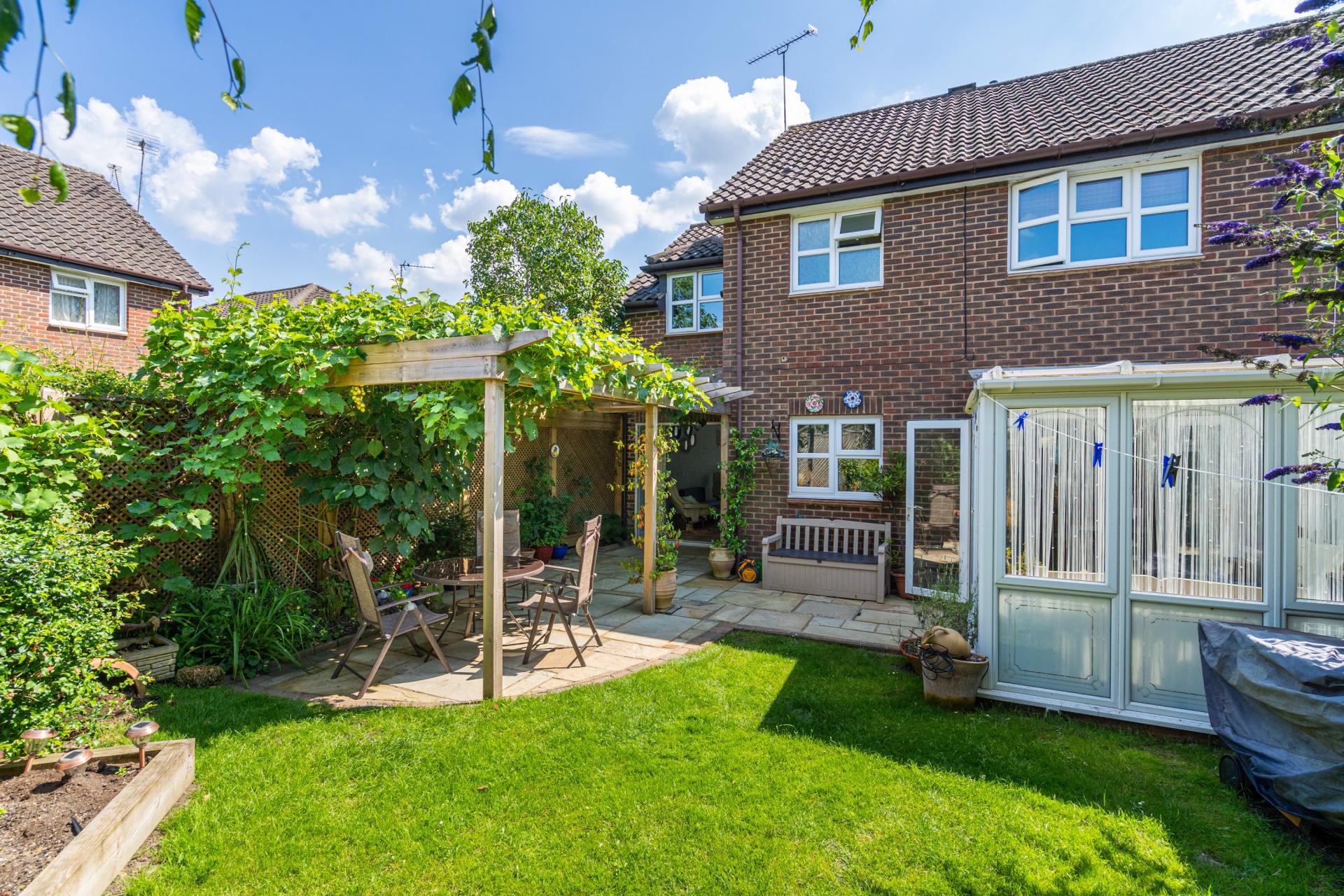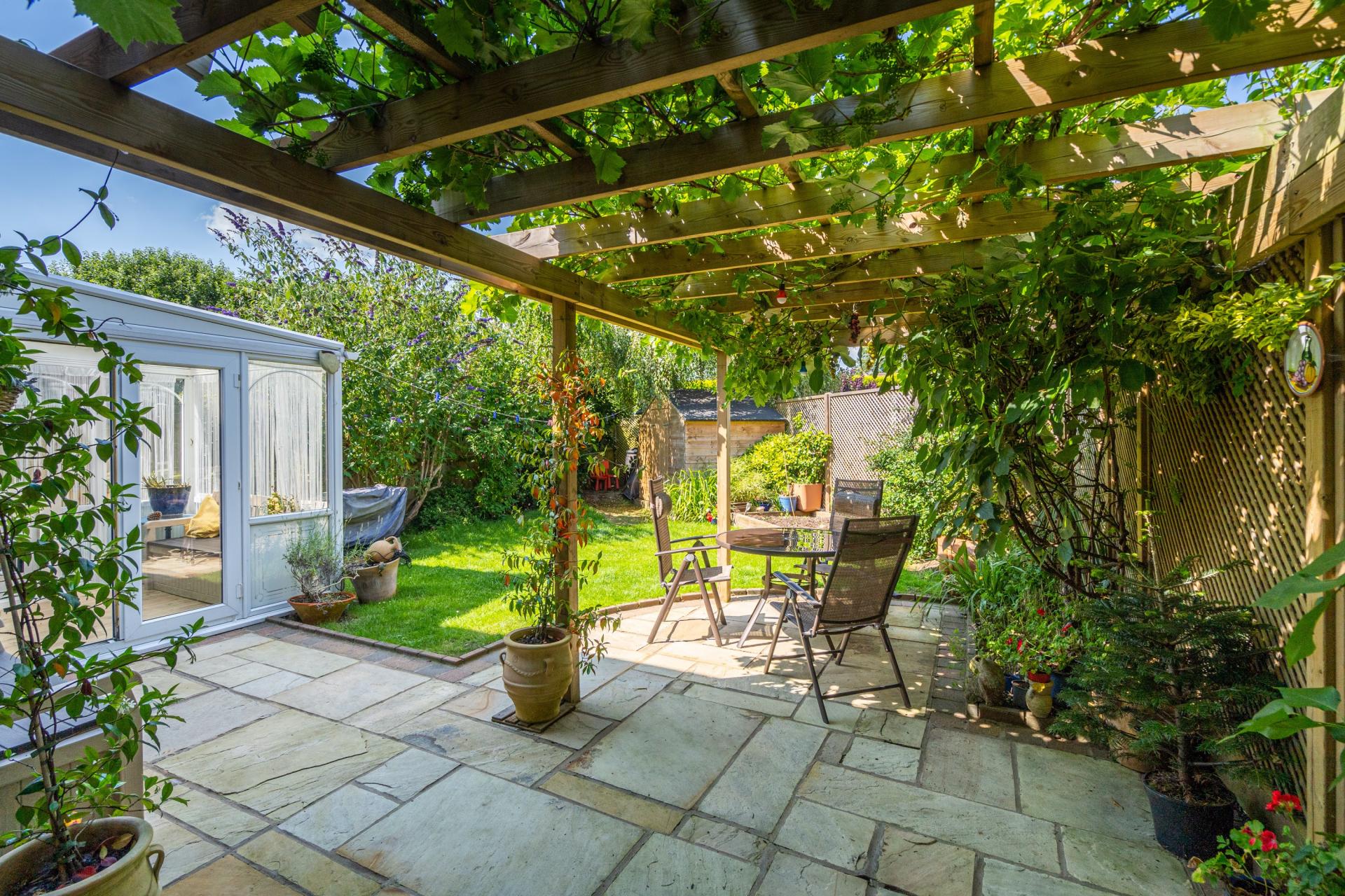 To the rear of the property, the garden has been well maintained by the current owners. There is a patio which sweeps across the rear of the house with an attractive pergola with established grape vine and climbers. Mature hedgerow gives privacy and there is a garden shed and useful outside tap.