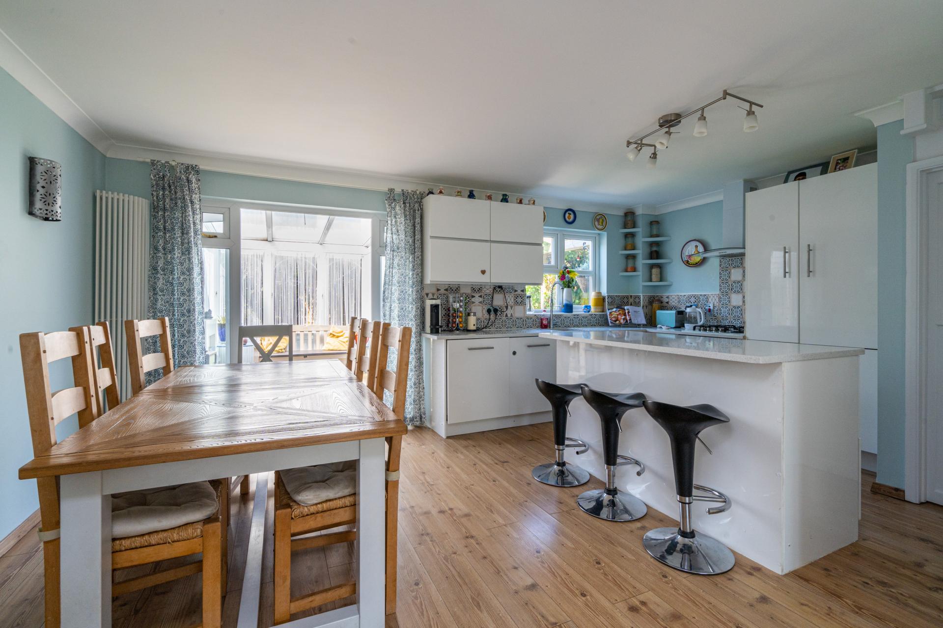 Inside, the Hallway leads to all rooms including the downstairs cloakroom. There is a good sized double aspect Living / Dining Room with wooden flooring leading to the contemporary Kitchen which has a full range of floor and wall mounted units set to Quartz worktop and incorporating a four ring gas hob with oven below and extractor above, a sink unit and integrated appliances including a dishwasher, washing machine and fridge/freezer. There is a useful understairs pantry cupboard and internal window giving light through to the hallway. There is also a Conservatory which opens out to the garden.
