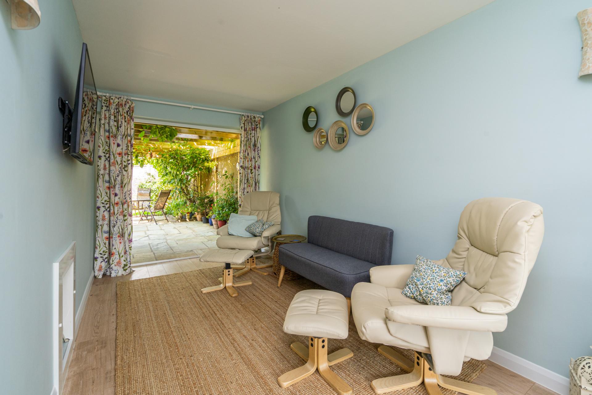 A further reception room has fitted furniture at one end, ideal for a home office and a feature electric log burner at the other with Bi-fold doors opening out to the patio and garden beyond.