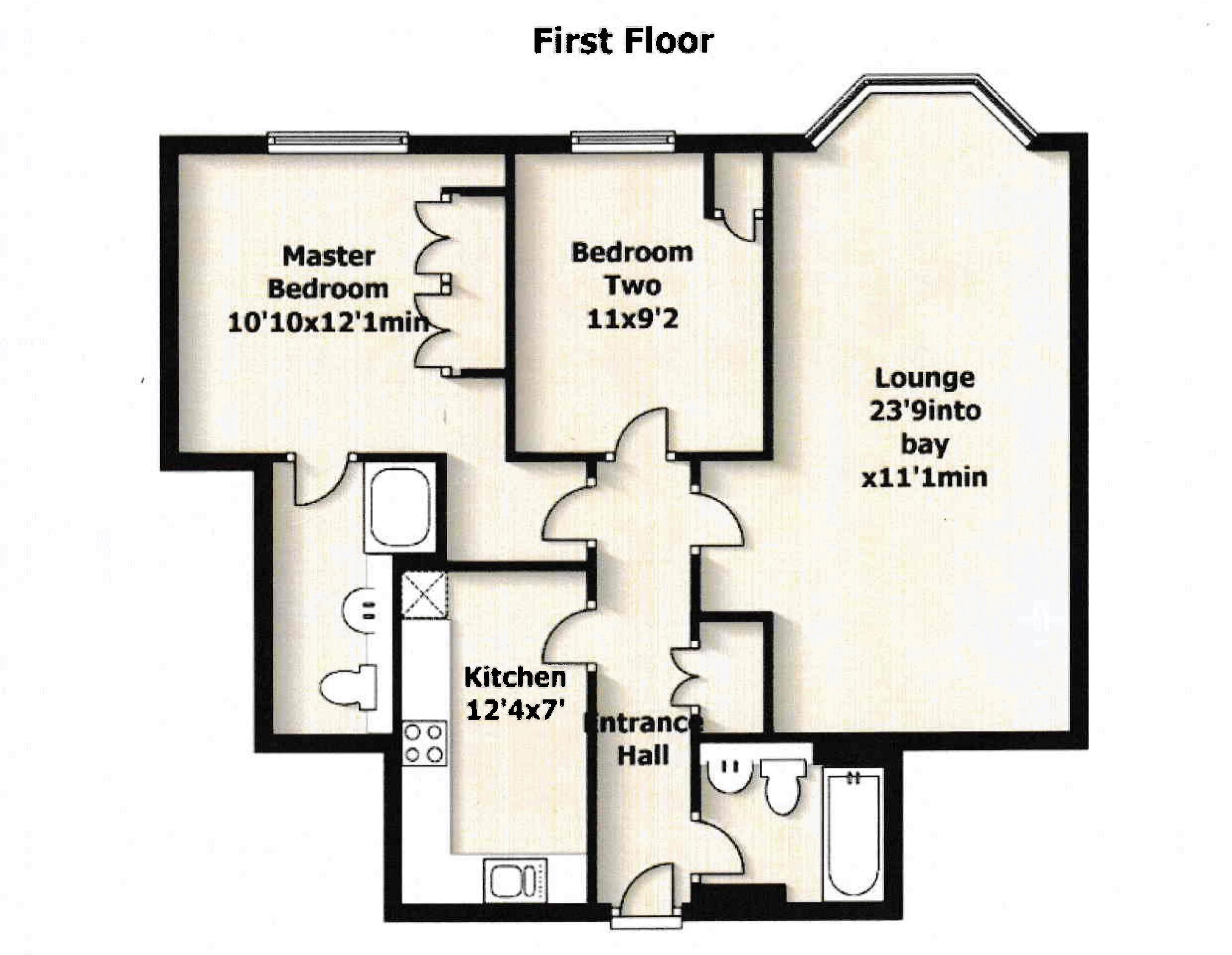 On arrival at Sovereign Beeches there are remote operated gates and pedestrian access to the parking. The communal entry door leads to the stairs and lift to first floor. Number 7 is located on the first floor, the front door leads to a light and airy hallway with doors to all rooms. including a double airing cupboard. The kitchen offers a range of wall and floor mounted units under ample work top which incorporates a sink with drainer and mixer tap. There is space and plumbing for a washing machine, dishwasher and space for a fridge / freezer. The Living Room features a gas effect fireplace and bay window overlooking the front. The master bedroom has fitted wardrobe cupboards and an en-suite shower room and the second bedroom has a single wardrobe. In the family bathroom there is a panelled bath and vanity unit incorporating a low level w.c and hand wash basin. The west facing communal rear garden is mainly laid to lawn with mature trees and flowers to the borders. To the front there are two allocated parking spaces. Lease: 125 years from 1st July 1998 (107 years remaining) Ground Rent: £250 pa. Service Charge £2358 pa (£196 pcm) Council Tax Band: F