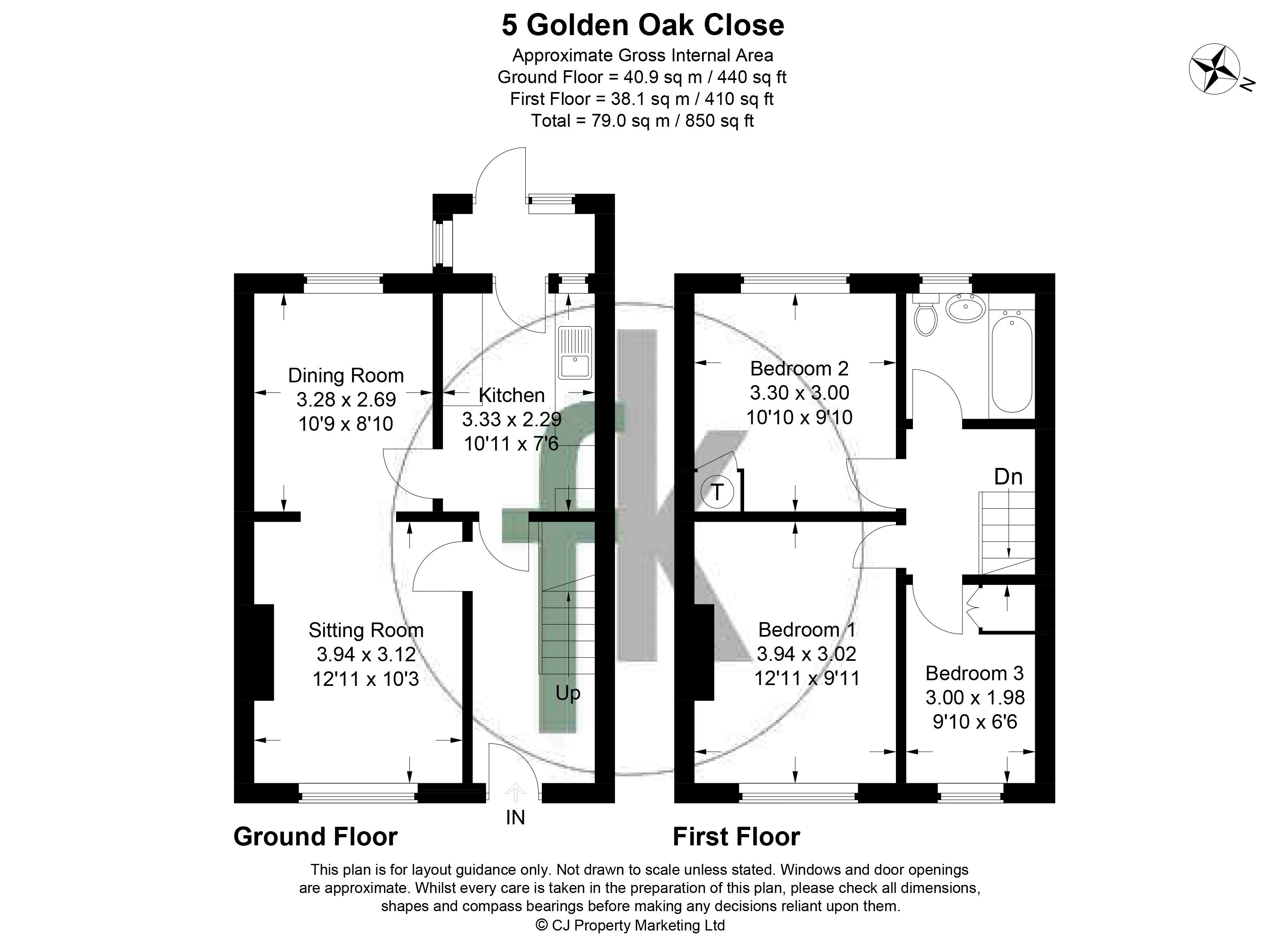 The front door leads to an entrance hallway with doors to all rooms and stairs to first floor.