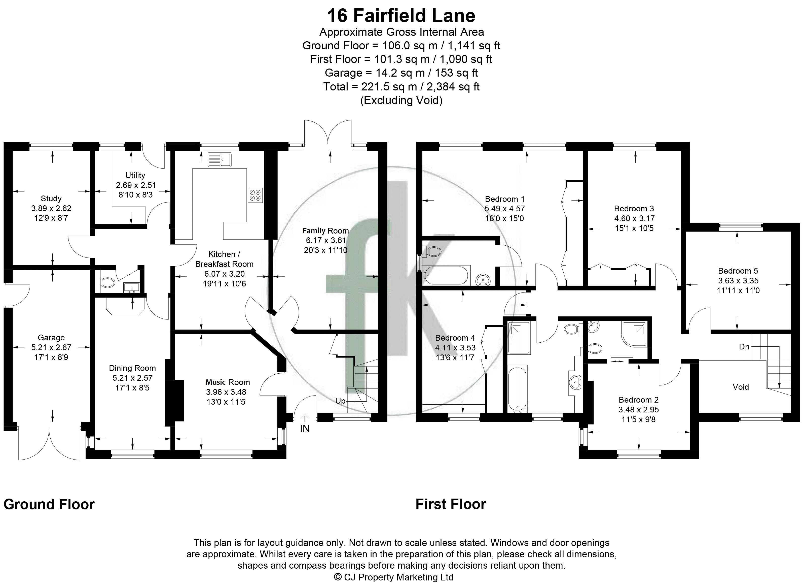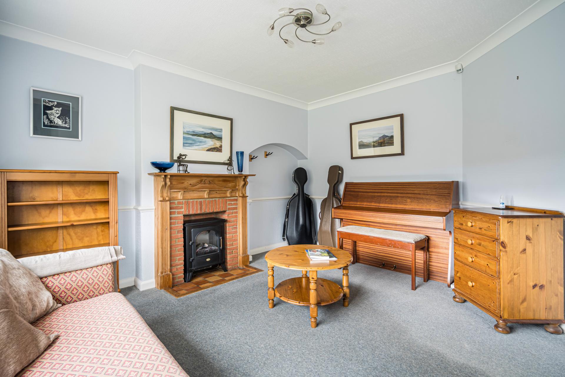 Inside, the Hallway with parquet flooring leads to all rooms and stairs to the first floor. There is a front aspect ‘Music Room’ with feature fireplace and a good sized ‘Family Room’with French Doors opening out to the garden.