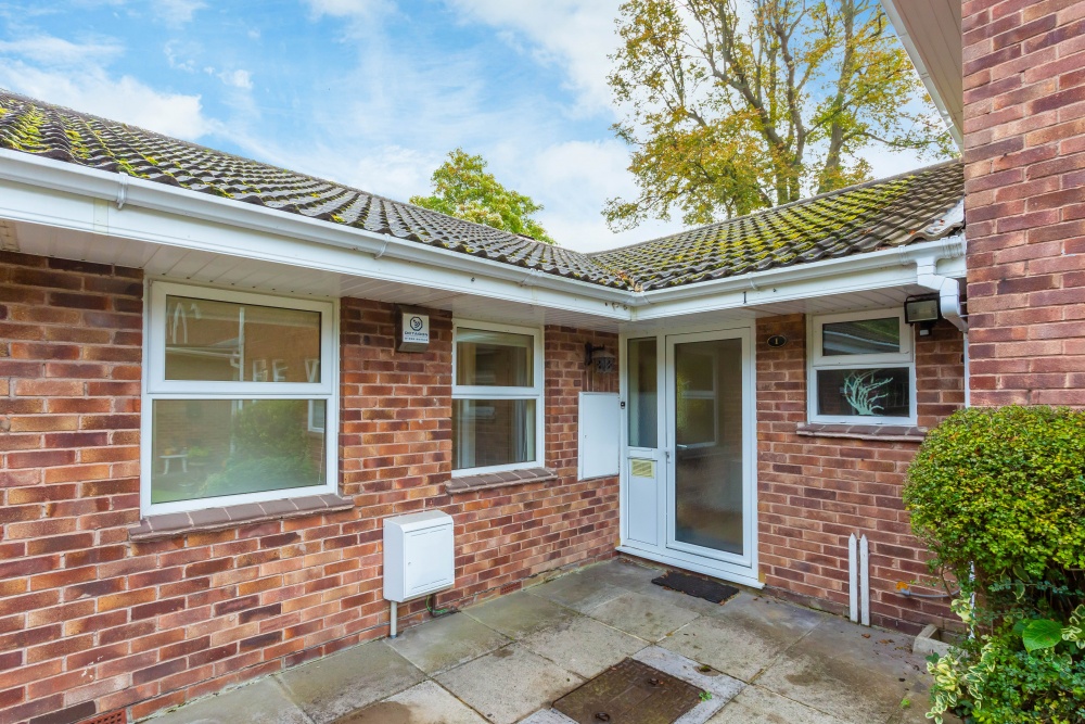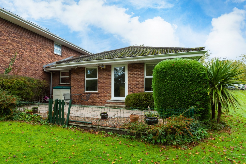 The bungalow is accessed via a few steps down to a front garden and the private front door to number 1.