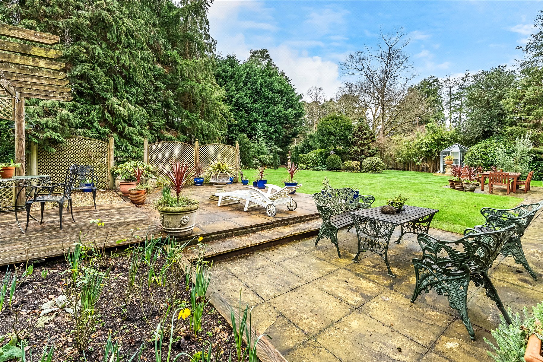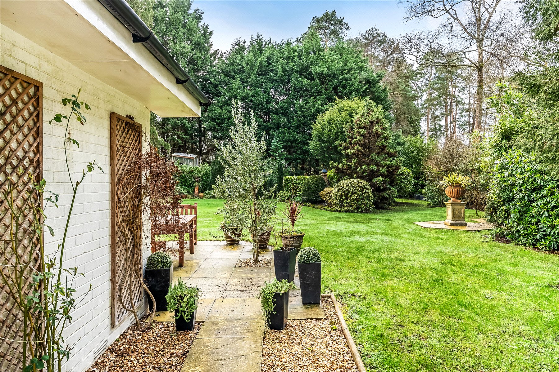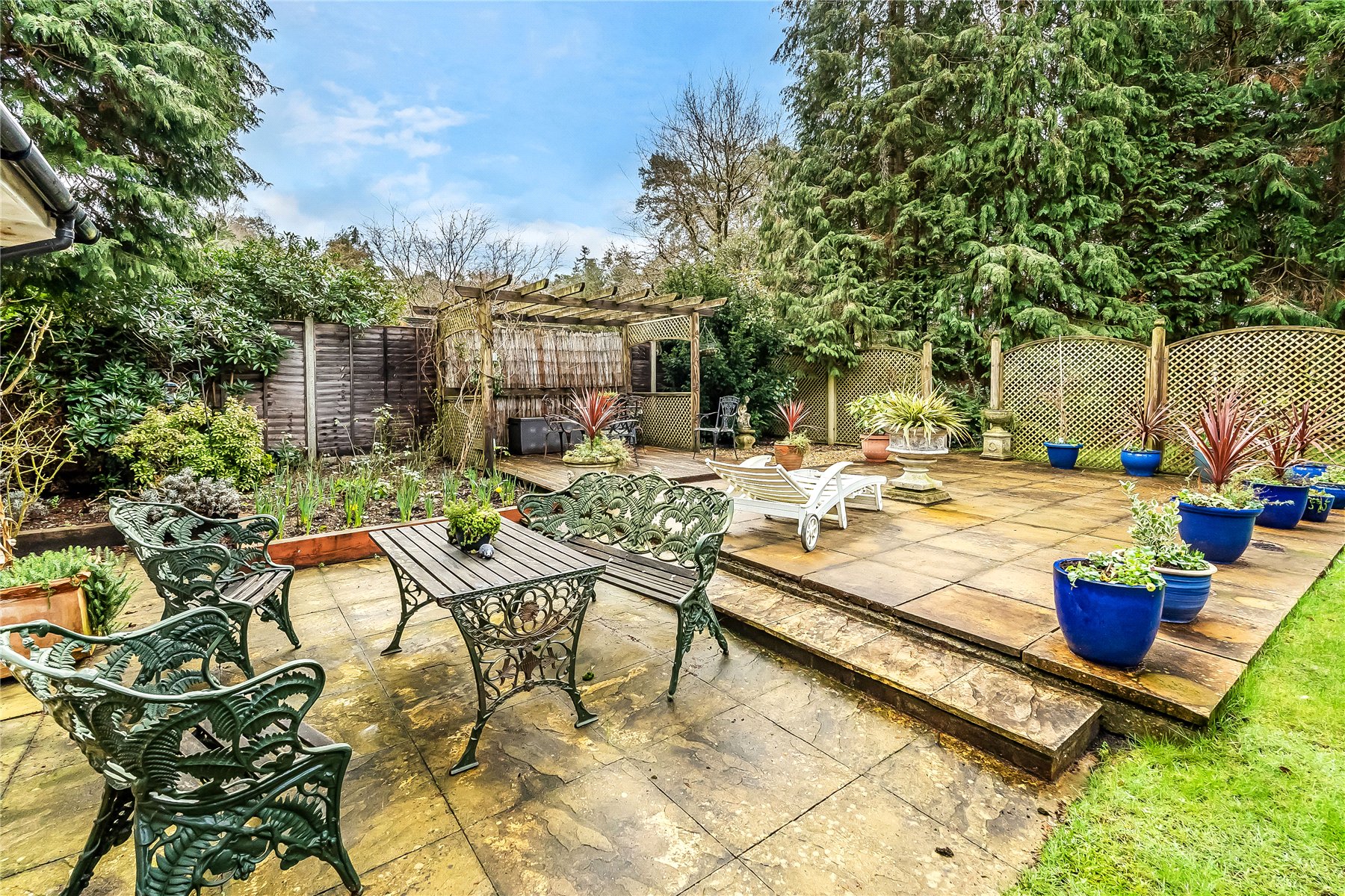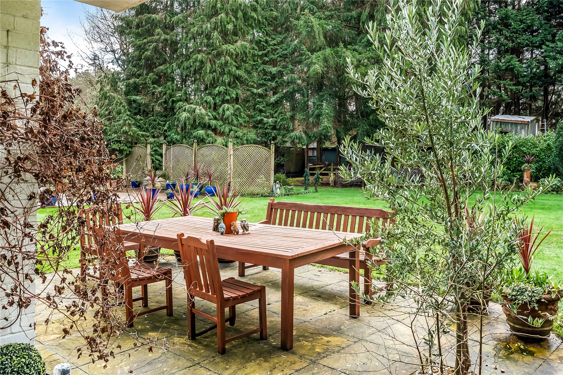 The south facing rear garden has been beautifully landscaped with a large lawn flanked by well stocked borders and mature trees. Adjacent to the dining room is a small patio area, whilst extending away from the sitting room is a generous terrace extending further up the garden which features a west facing pergola, ideal for providing shade from the sun or a sheltered spot later into the evening.