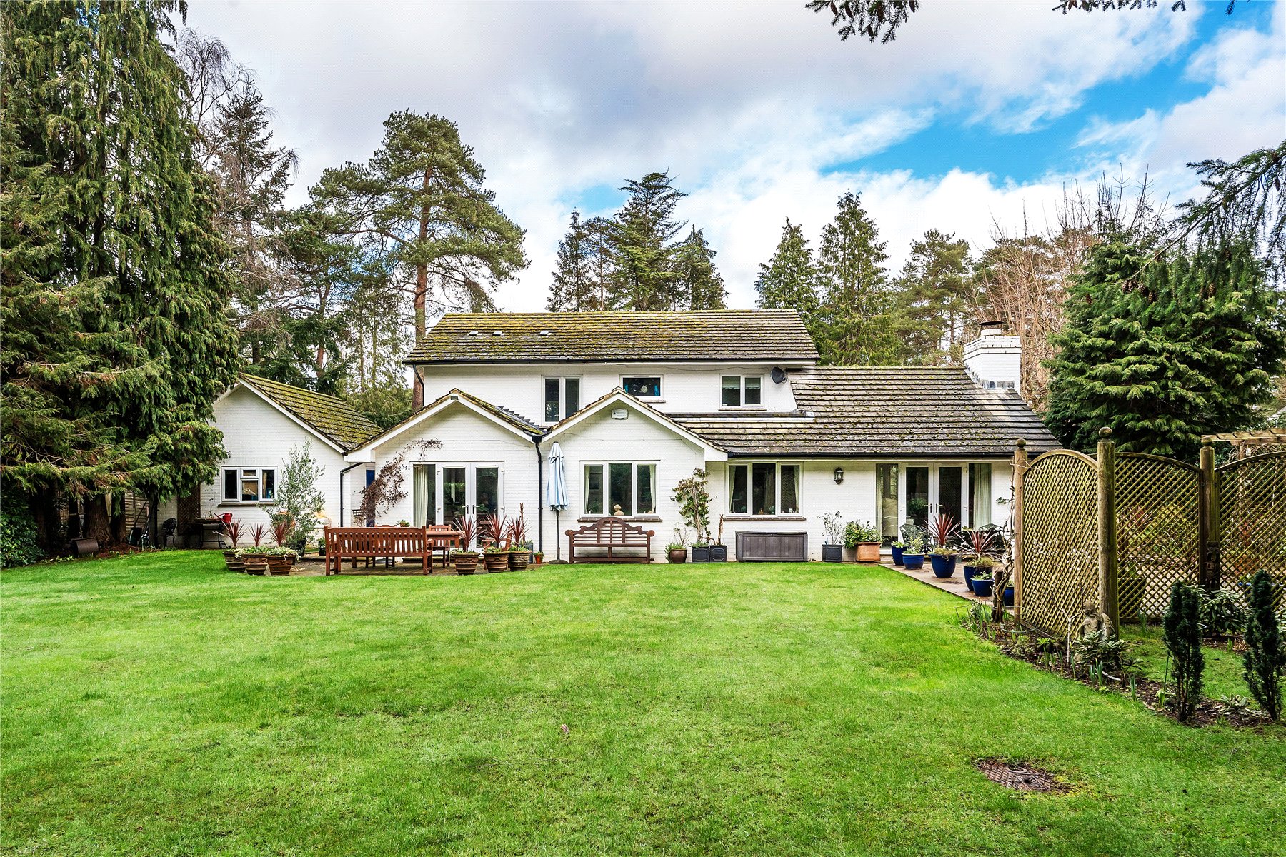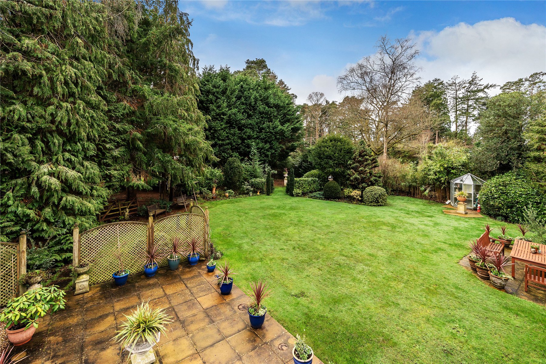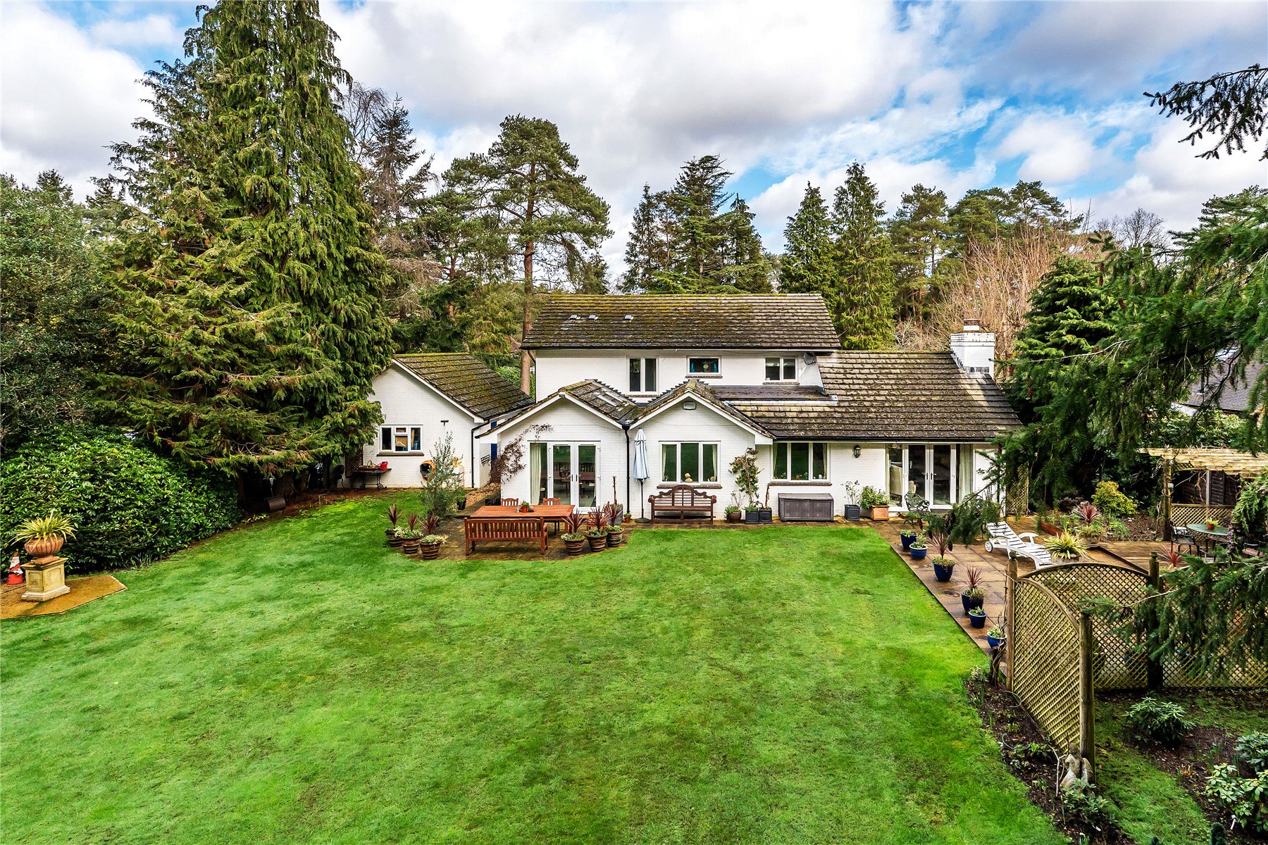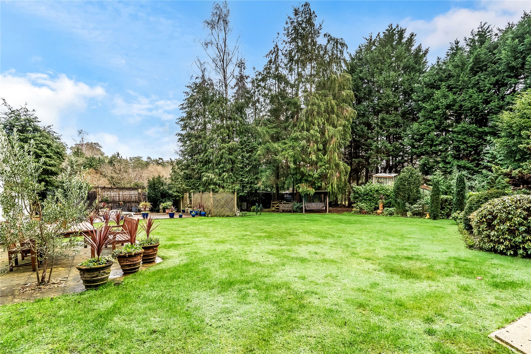 The south facing rear garden has been beautifully landscaped with a large lawn flanked by well stocked borders and mature trees. Adjacent to the dining room is a small patio area, whilst extending away from the sitting room is a generous terrace extending further up the garden which features a west facing pergola, ideal for providing shade from the sun or a sheltered spot later into the evening.