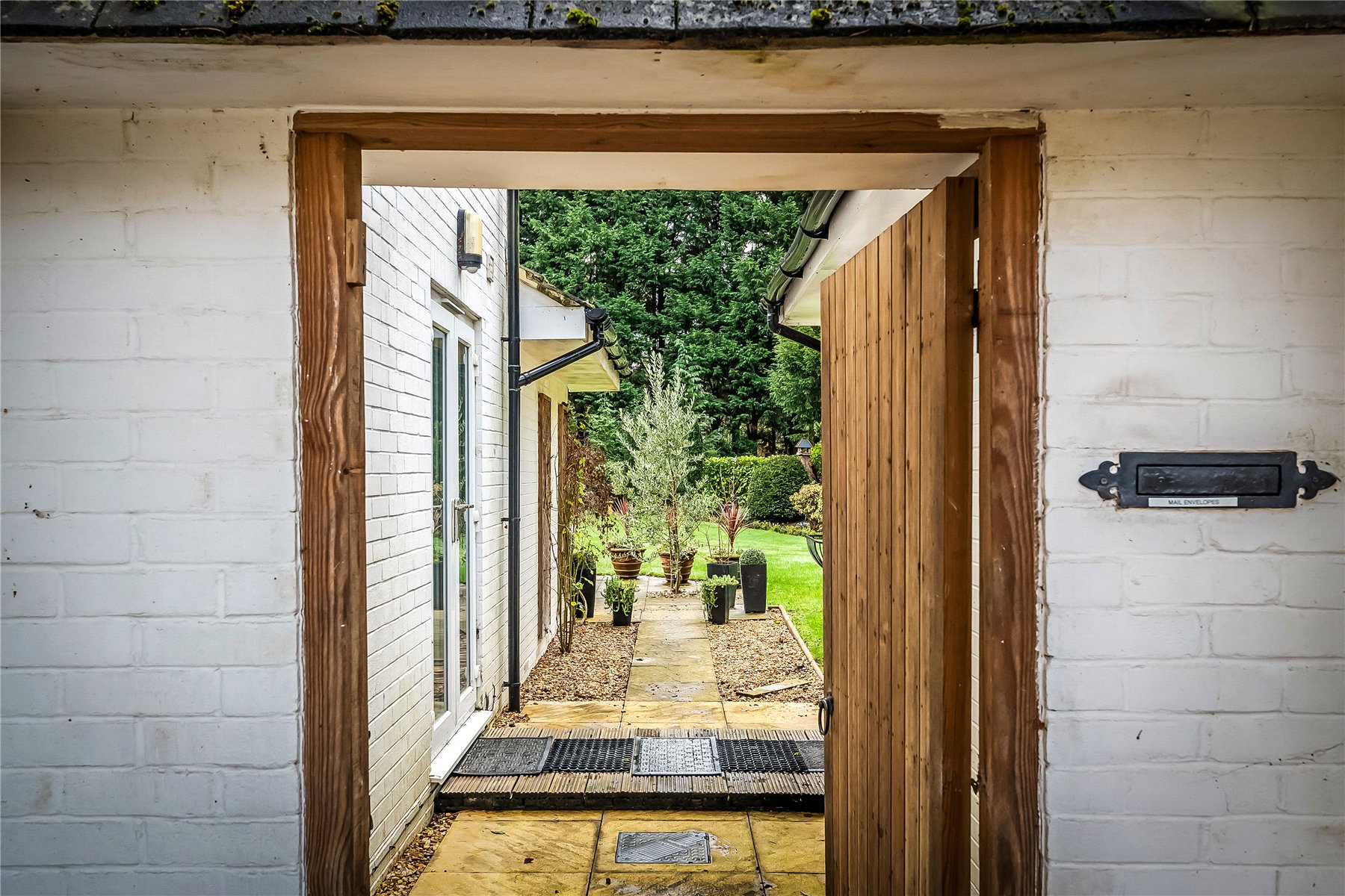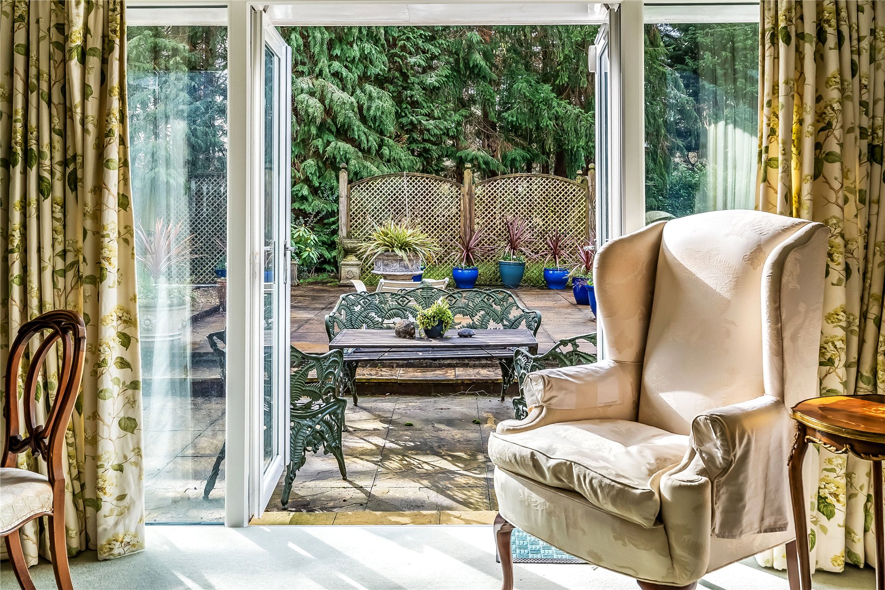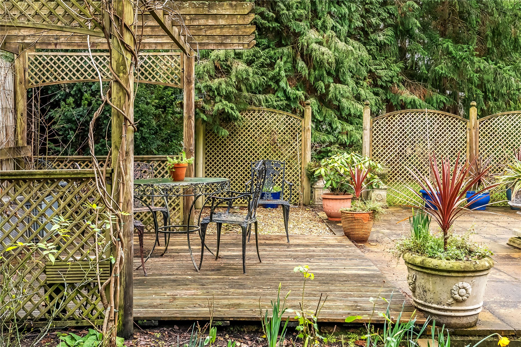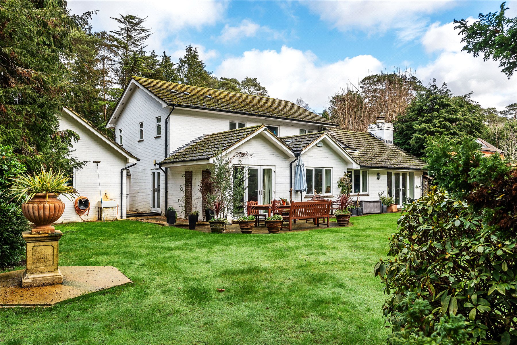 The south facing rear garden has been beautifully landscaped with a large lawn flanked by well stocked borders and mature trees. Adjacent to the dining room is a small patio area, whilst extending away from the sitting room is a generous terrace extending further up the garden which features a west facing pergola, ideal for providing shade from the sun or a sheltered spot later into the evening.