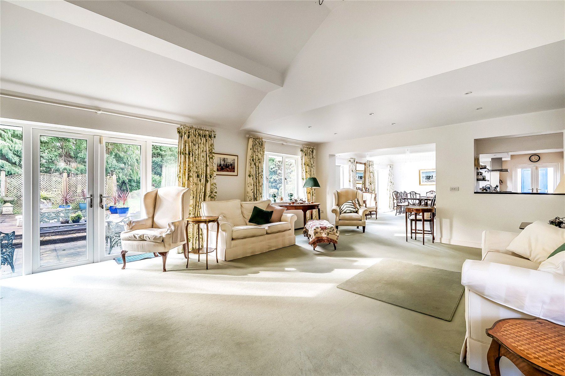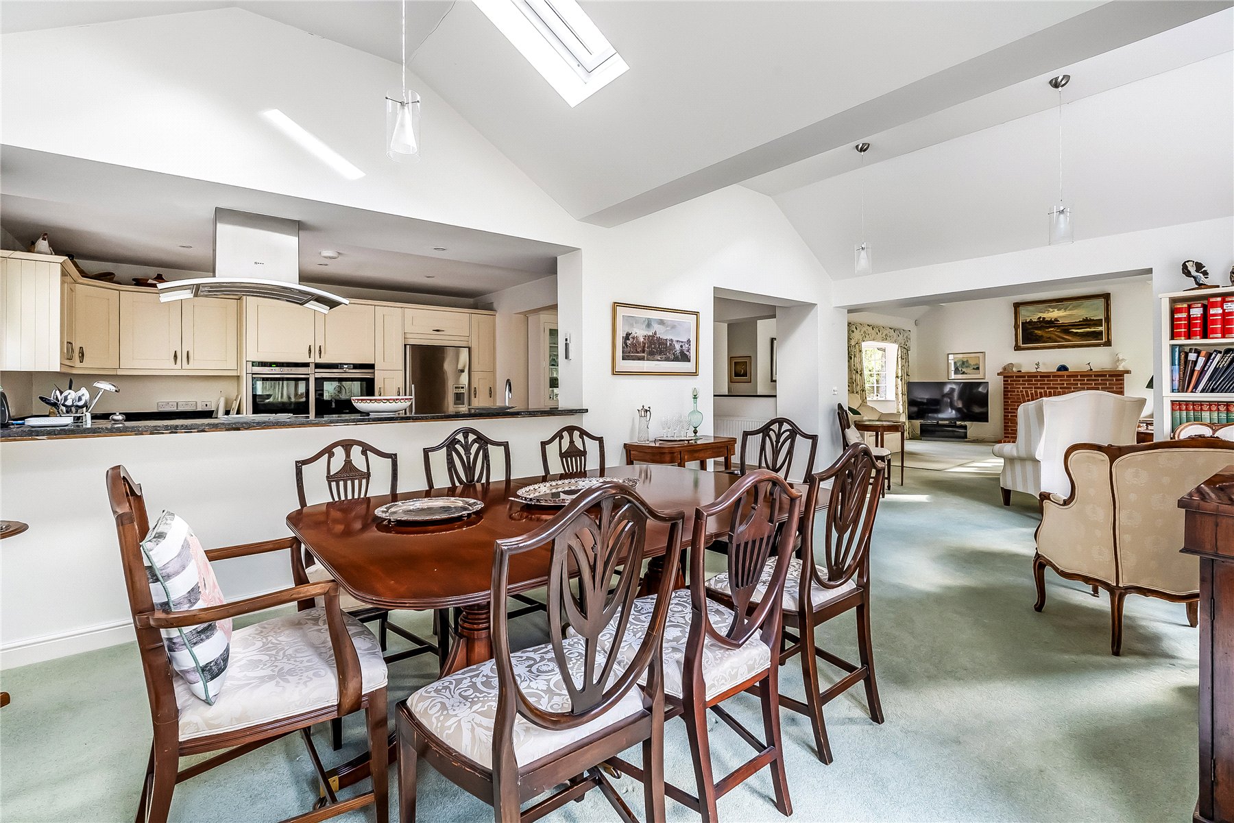 The principle reception accommodation is all to the rear; enjoying a sunny, southerly aspect. The formal sitting room is part vaulted and double aspect with patio doors directly onto the garden with a feature bay window and brick fireplace with working open fire this is a great room in which to gather family or entertain. This is open plan via a wide opening to a part vaulted dining room; also benefiting from patio doors onto the south facing garden.
