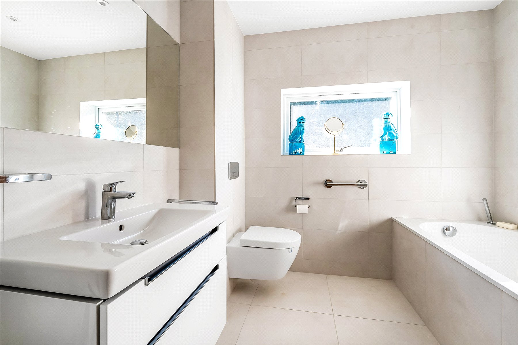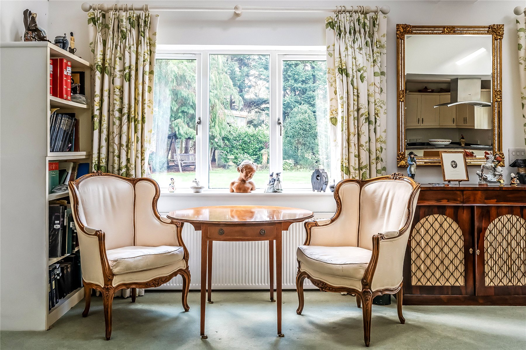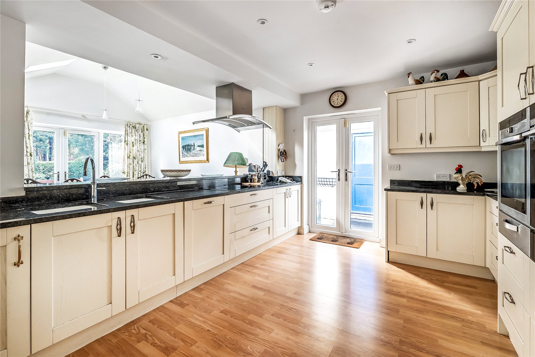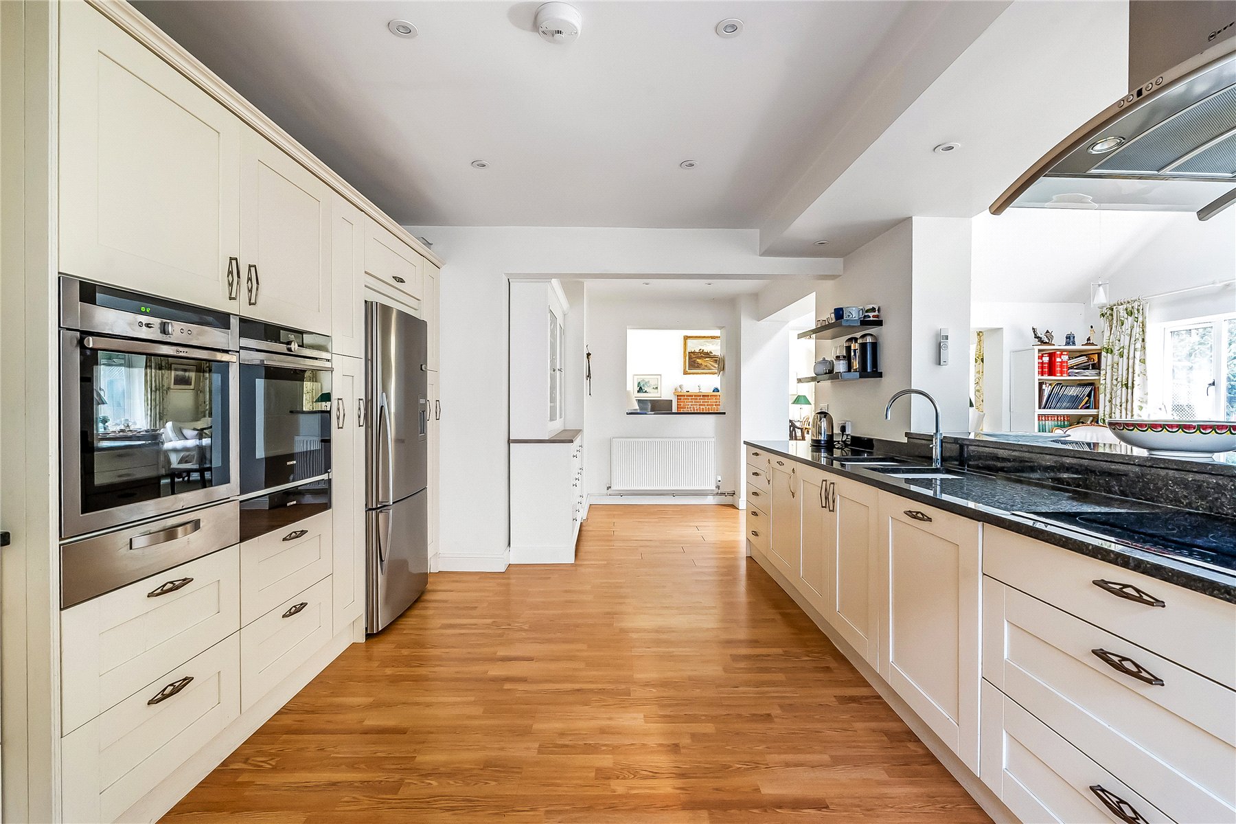 The kitchen sits behind the dining room with a wide aperture between the two; fitted in a contemporary style there is extensive drawer and cupboard storage topped with attractive granite worktops. There are two integrated ovens, 2 warming drawers, 2 dishwashers, an induction hob and a double sink with Quooker tap. There is an external door to the side offering easy access to both the front and rear garden and garage. There is also a separate utility room with space and plumbing for white goods.