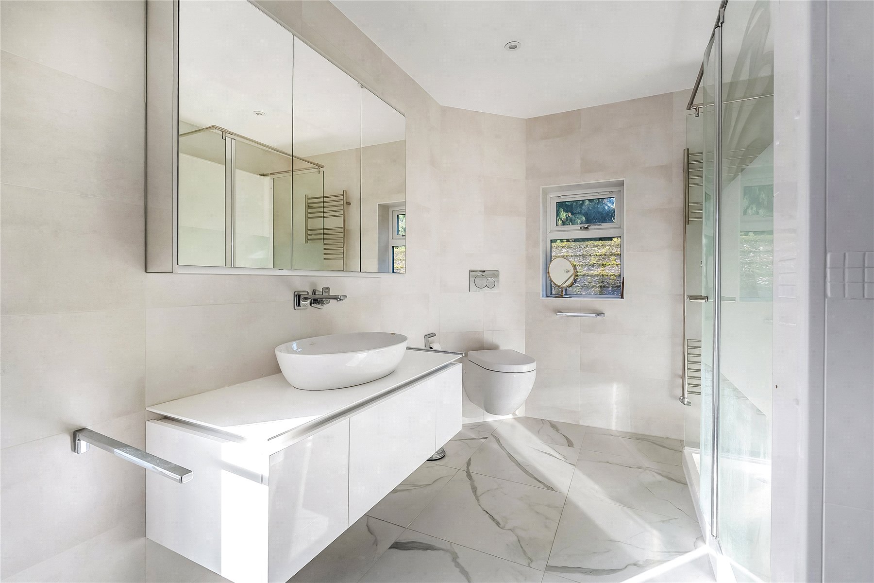 To the first floor are three bedrooms, and a family bathroom (with underfloor heating). Of particular note is the master suite which stretches the full depth of the house offering a generous dual aspect double bedroom with built in wardrobes and a large en suite featuring a walk in shower and also enjoying a dual aspect.