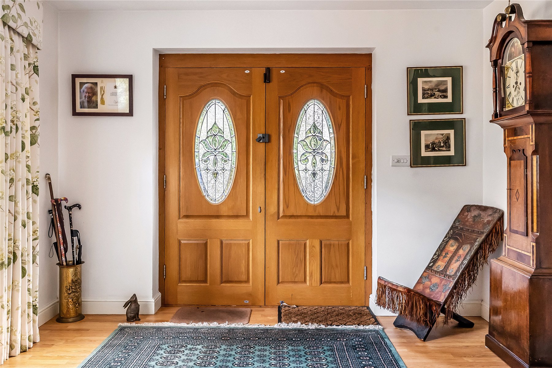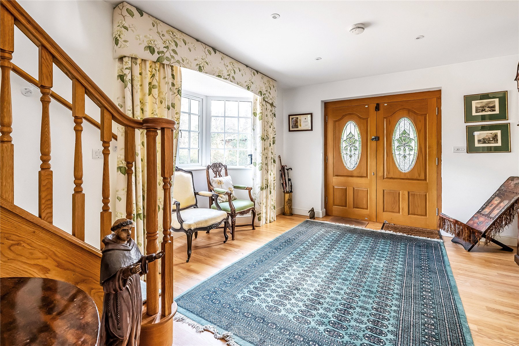 A pitched entrance porch frames attractive part glazed double wooden doors which open into a spacious and welcoming entrance hall with bay window to the front. There is a useful cloakroom tucked away just off the hallway.