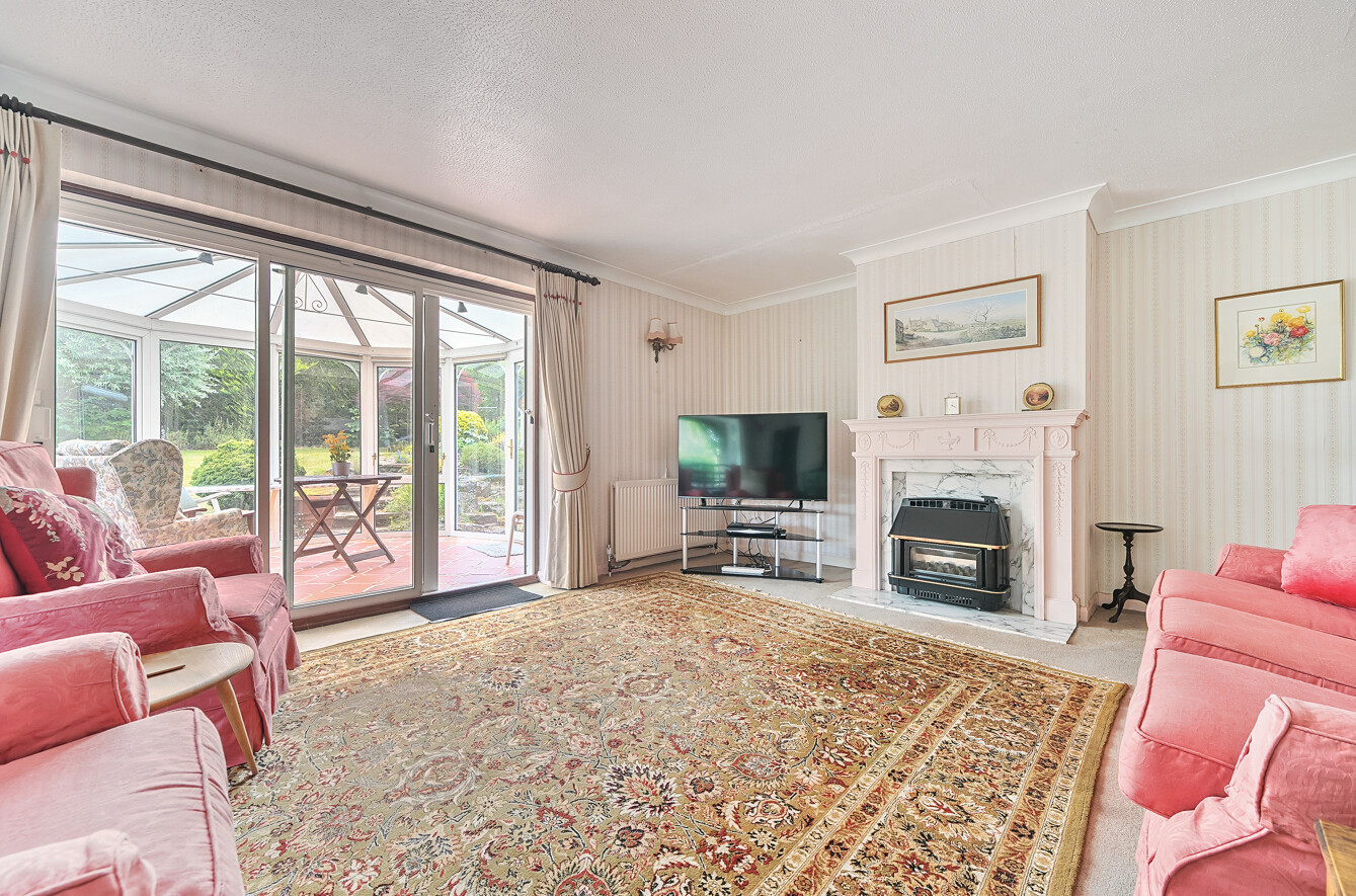 27'1 wide double aspect living room with central fireplace, bay window and patio doors onto a south facing conservatory over looking the rear garden. Plenty of space for lounge and dining furniture with the conservatory adding extra flexibility