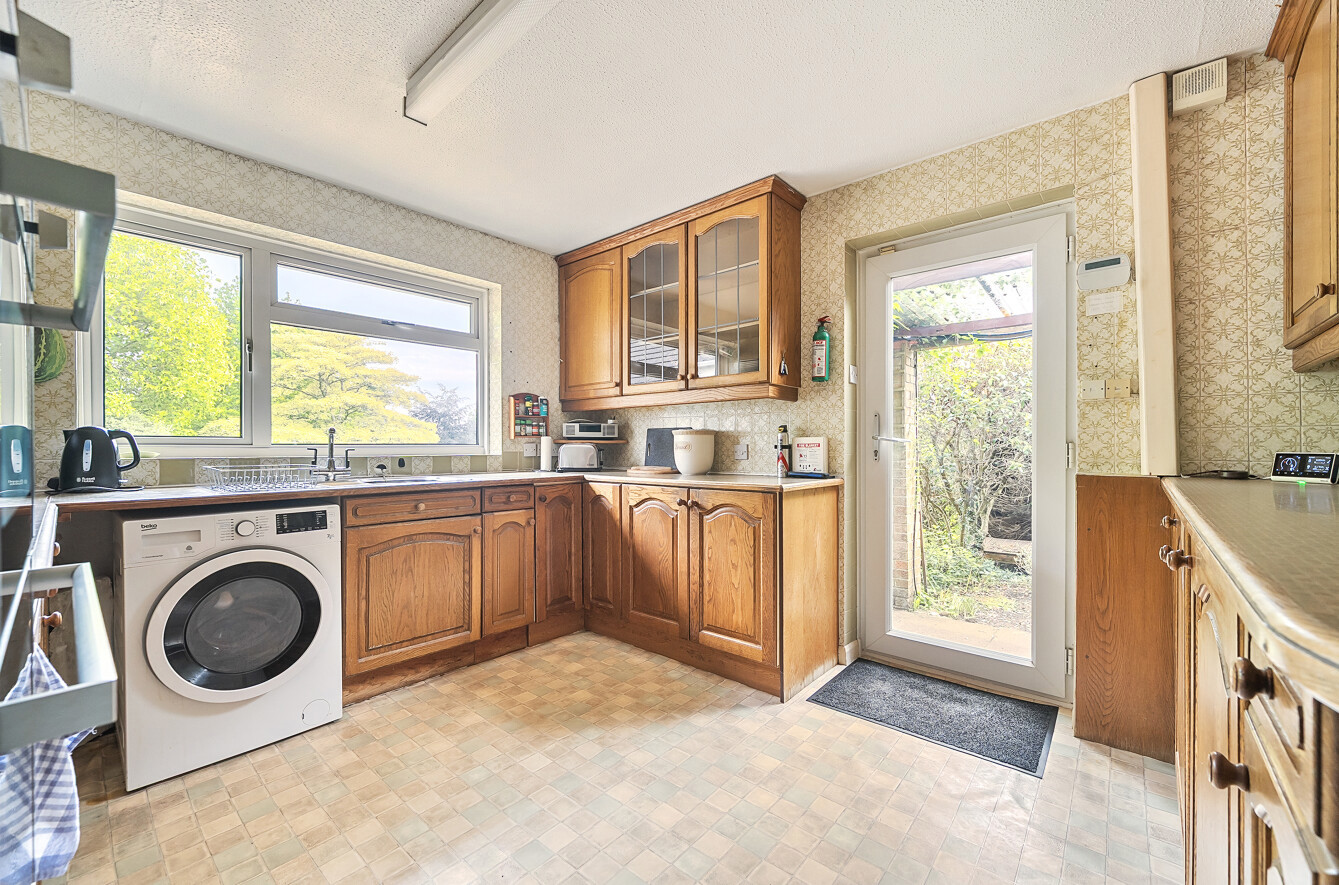Fitted kitchen with a range of drawer and cupboard storage, including integrated oven and hob with space for further white goods. Side door offering garden access
